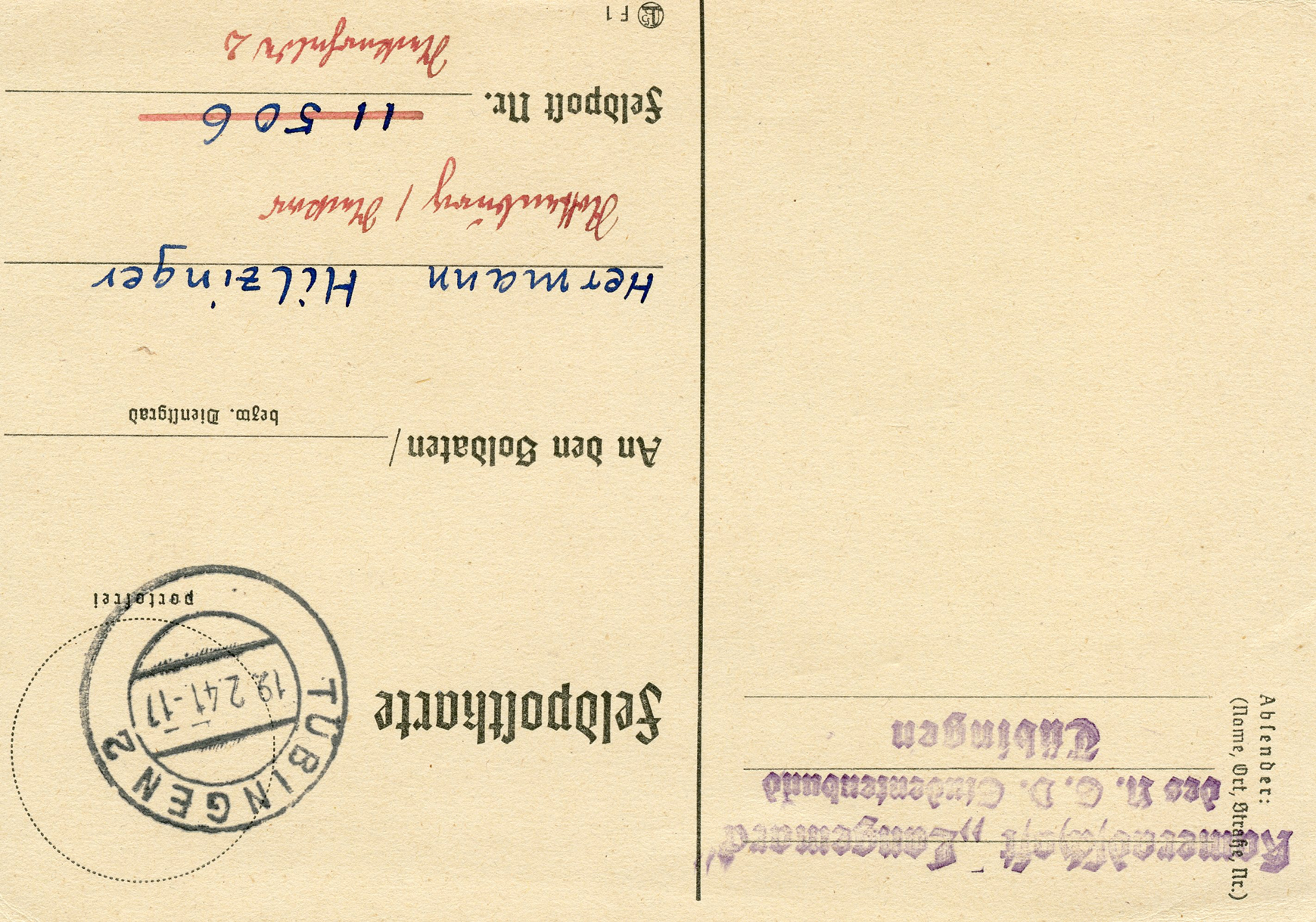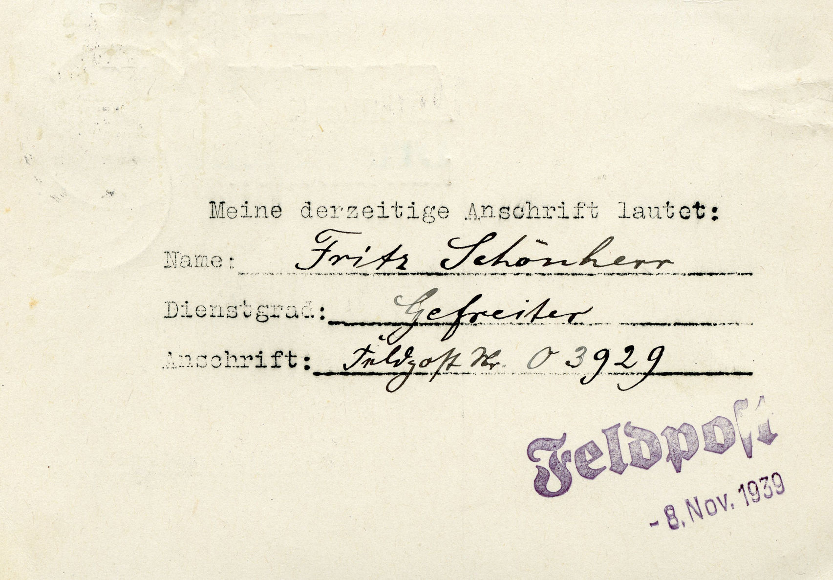 [Below: Reverse. Interesting. This was sent stamped Feldpost from a soldier. It says: Meine derzeitige Anschrift Lautet' (My current address is), he is a 'Gefreiter' (private) with the Feldpost number 03929.]