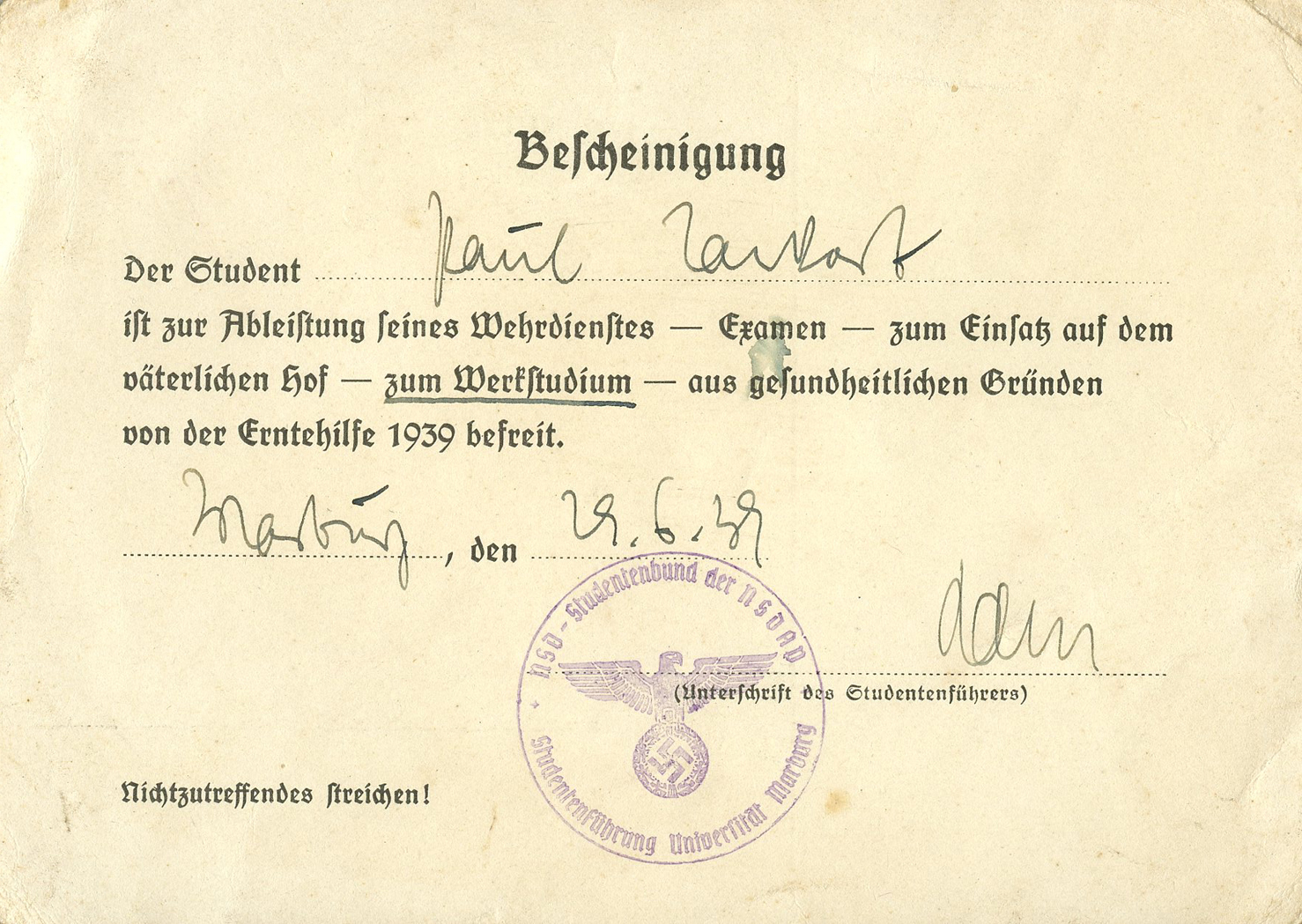 'Bescheinigung - Der Student Paul Lackert ist zur Ableistung Seines Wehrdienstes - Examen - zum Einsatz auf dem väterlichen hof - zum Werkstudium - aus gesundheitlichen Gründen von der Erntehilfe 1939 befreit.'