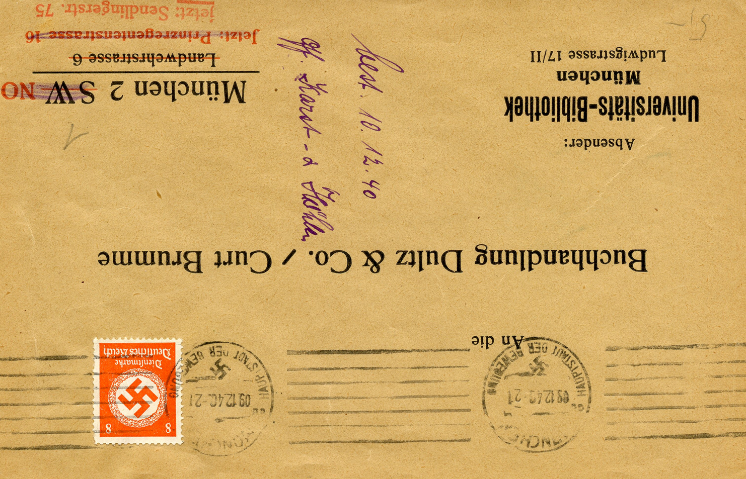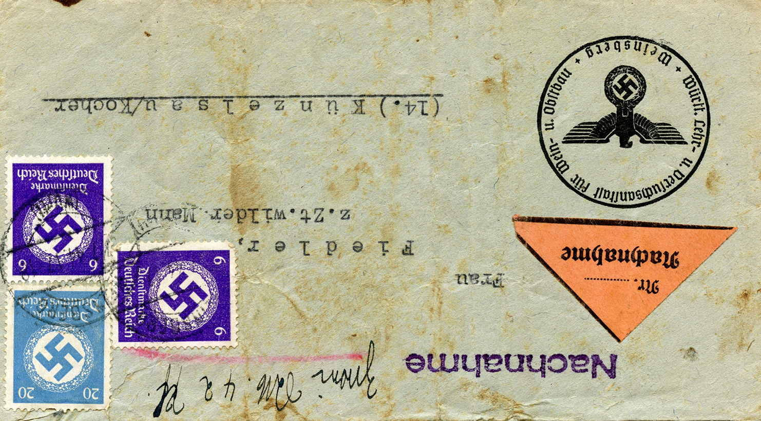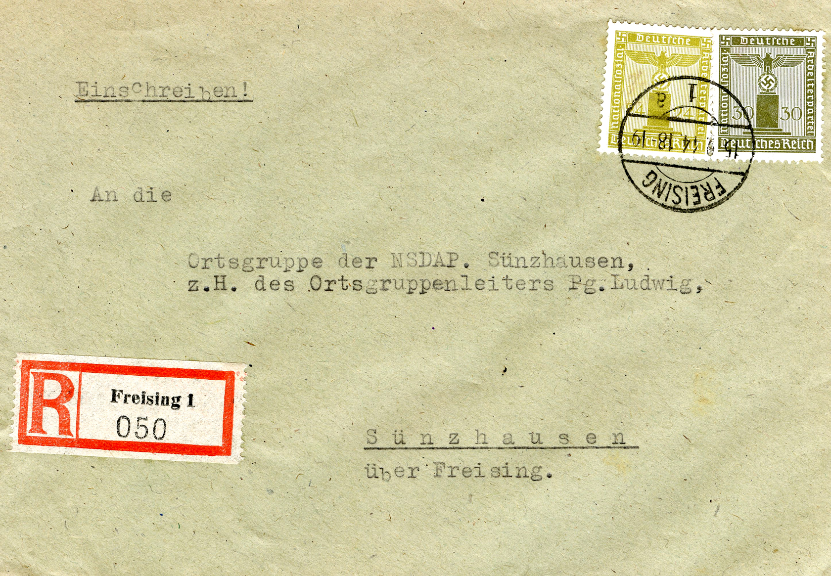 'An die Ortsgruppe der NSDAP. Sünzhausen, z.H. des Ortsgruppenleiters Pg. Ludwig' (To the NSDAP Local Group, Sünzhausen, Attn: Local Group Leader Pg.) This was postmarked on September 15, 1944.]