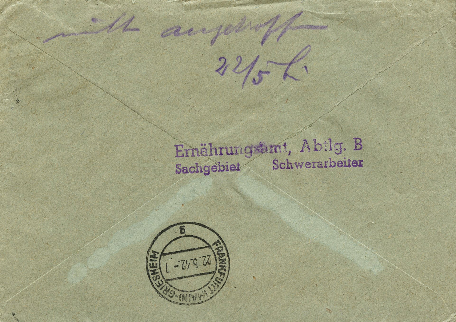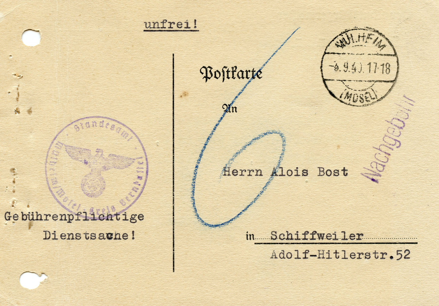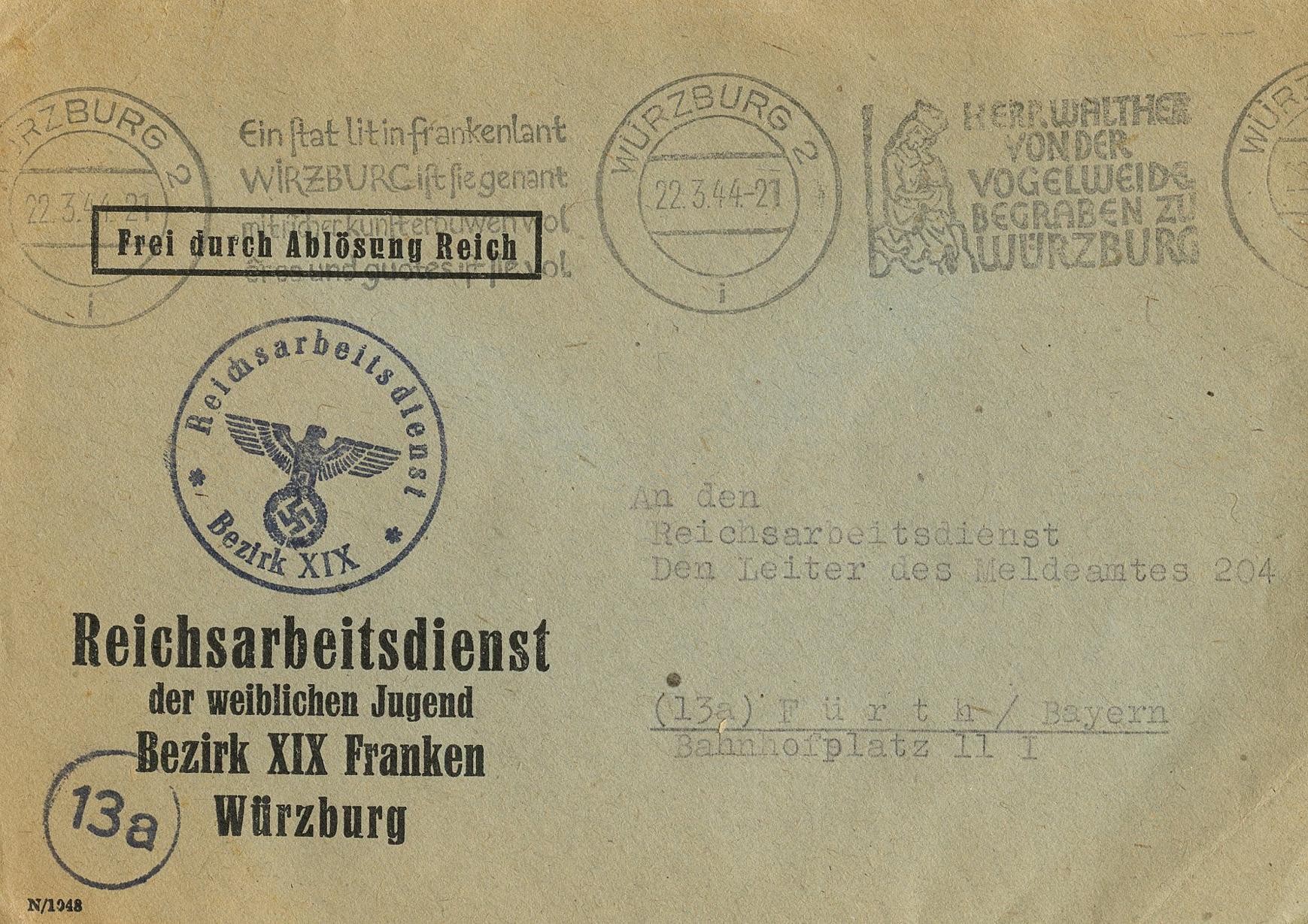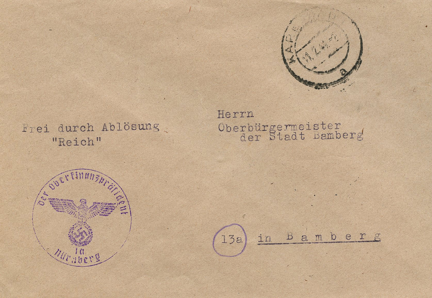 'An die Ortsgruppe der NSDAP. Sünzhausen, z.H. des Ortsgruppenleiters Pg. Ludwig' (To the NSDAP Local Group, Sünzhausen, Attn: Local Group Leader Pg.) This was postmarked on September 15, 1944.]