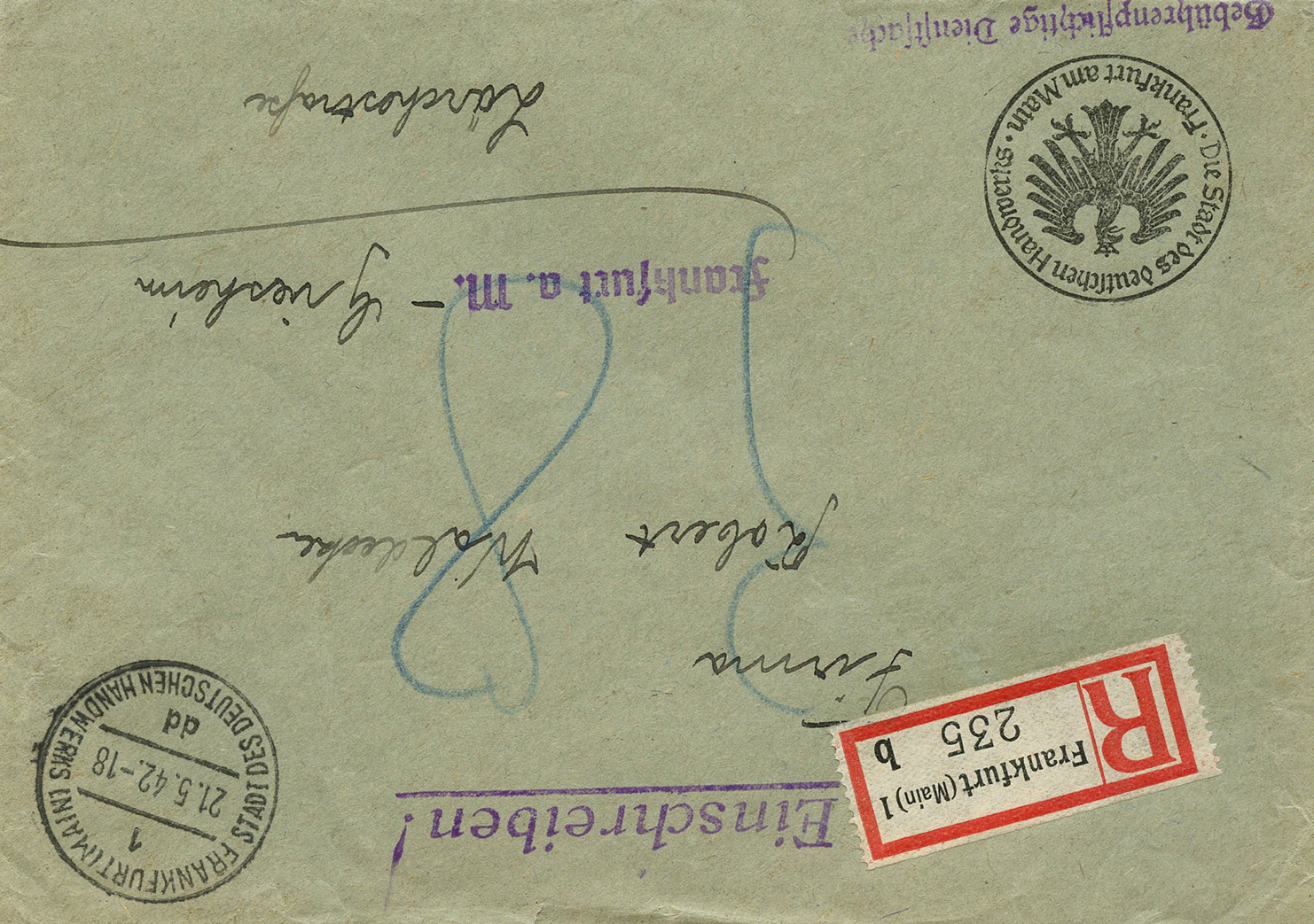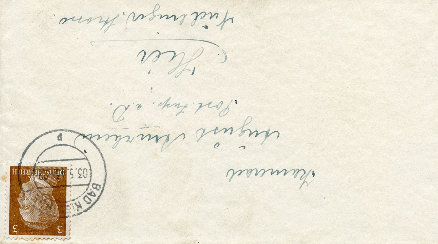 [Below: This was sent to Litzmannstadt, the city with the Jewish ghetto. They've crossed out the old street name and changed it to 'H Göring Str'. Whether this was missent to someone at the wrong street or the street name changed, I'm not sure, but it is very likely the latter. Unfortunately the date is missing from the postmark. The reverse is blank.]