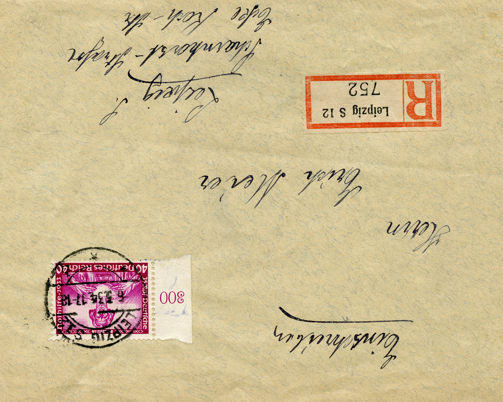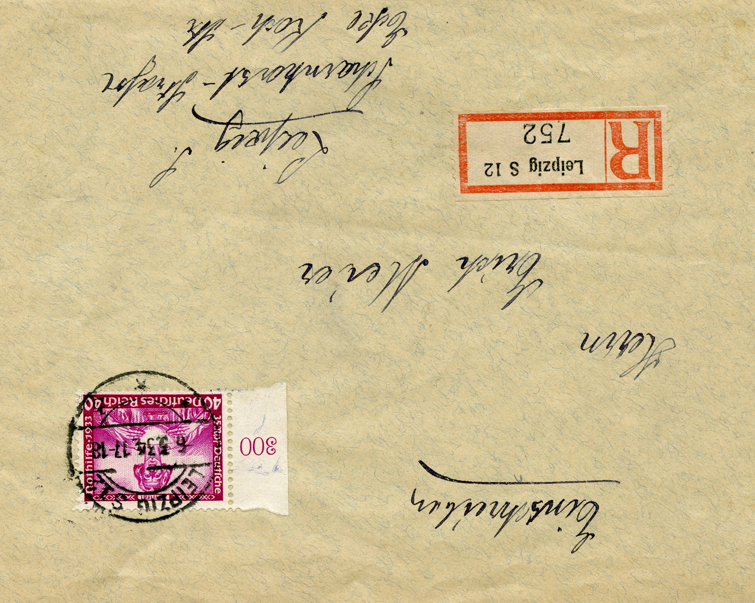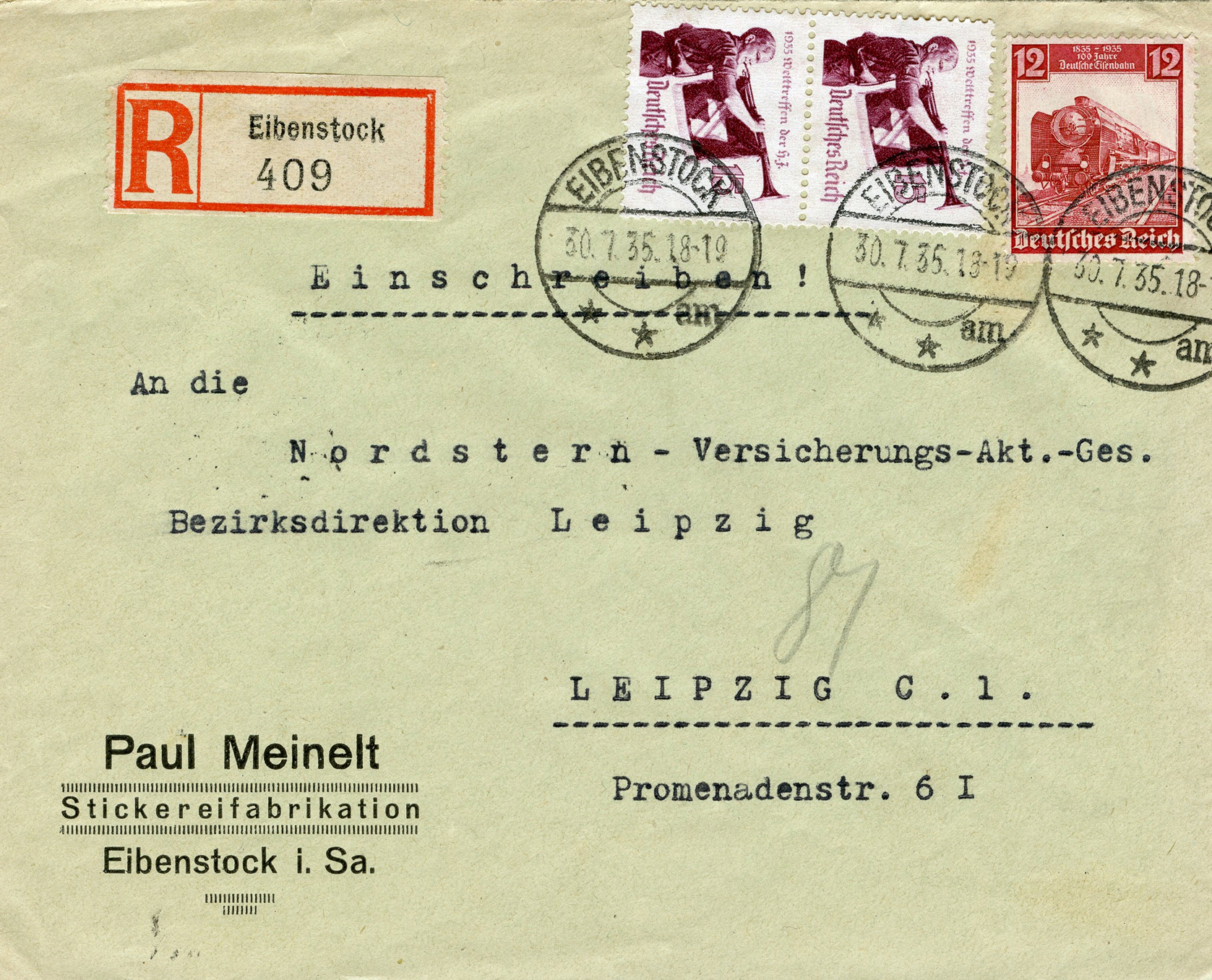 [Below: This was sent registered on July 30, 1935 to 'Nordstern - Versicherungs' (Nordstern Insurance) from 'Paul Meinelt - Stickereifabrikation' (Paul Meinelt - Embroidery Manufacturing). This insurance company was bought out in 1997 by another company, but the embroidery company is completely lost to time.]