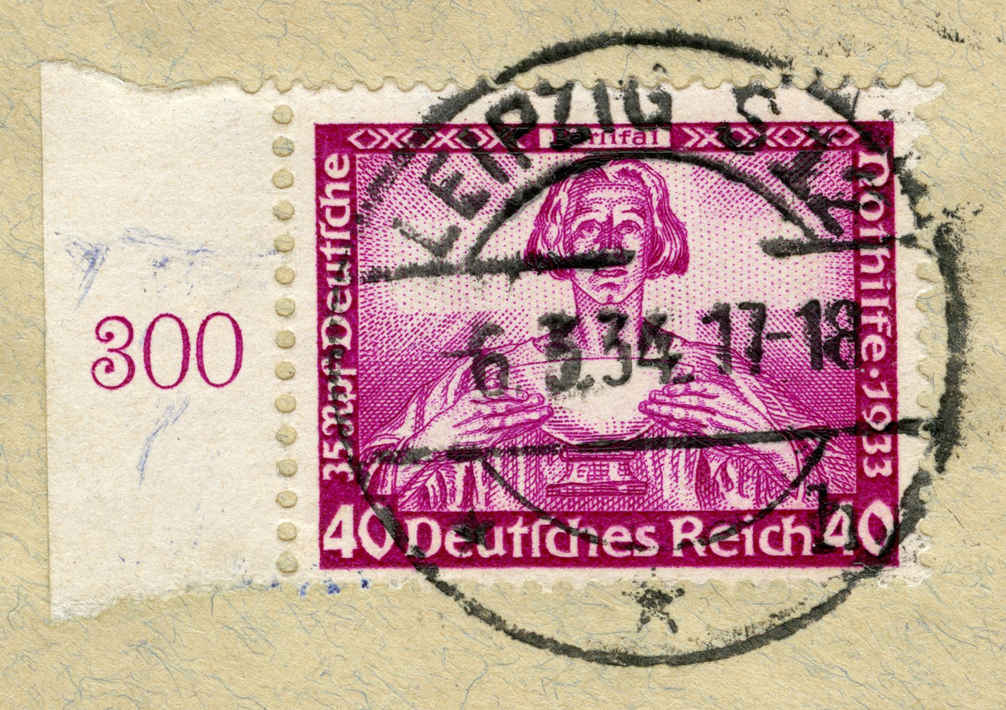 [Below: Close-up. This was postmarked on March 6, 1934. This stamp shows Parsifal with the Grail.]
