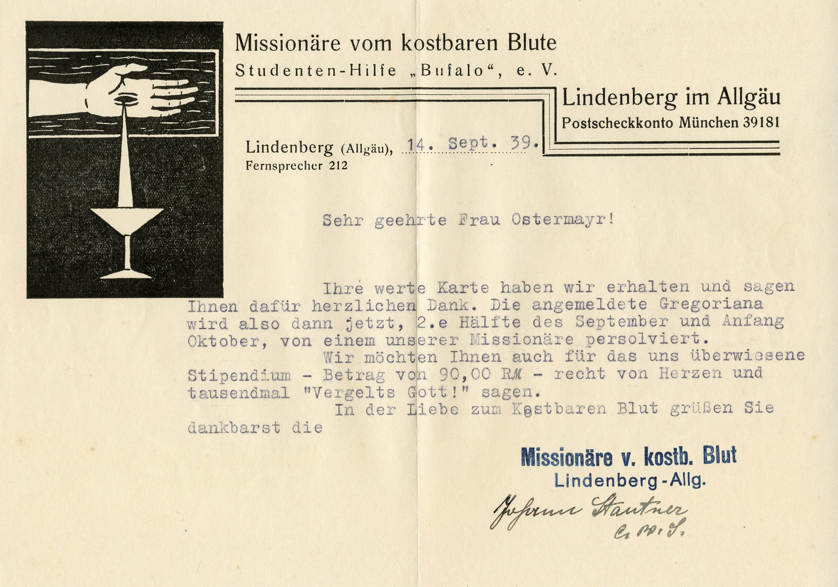 [Below: Interesting graphic. This is sent to a woman who invited missionaries to the 'Gregorian Gymnasium' and thanking her for sending them 90 RM.]