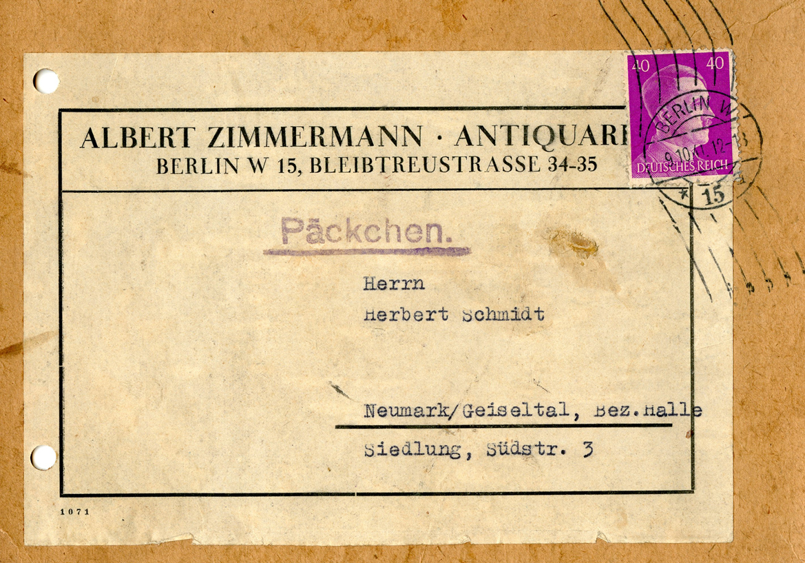 [Below: Here is another package front, except this one is civilian. This was postmarked on October 9, 1941 in Berlin.]