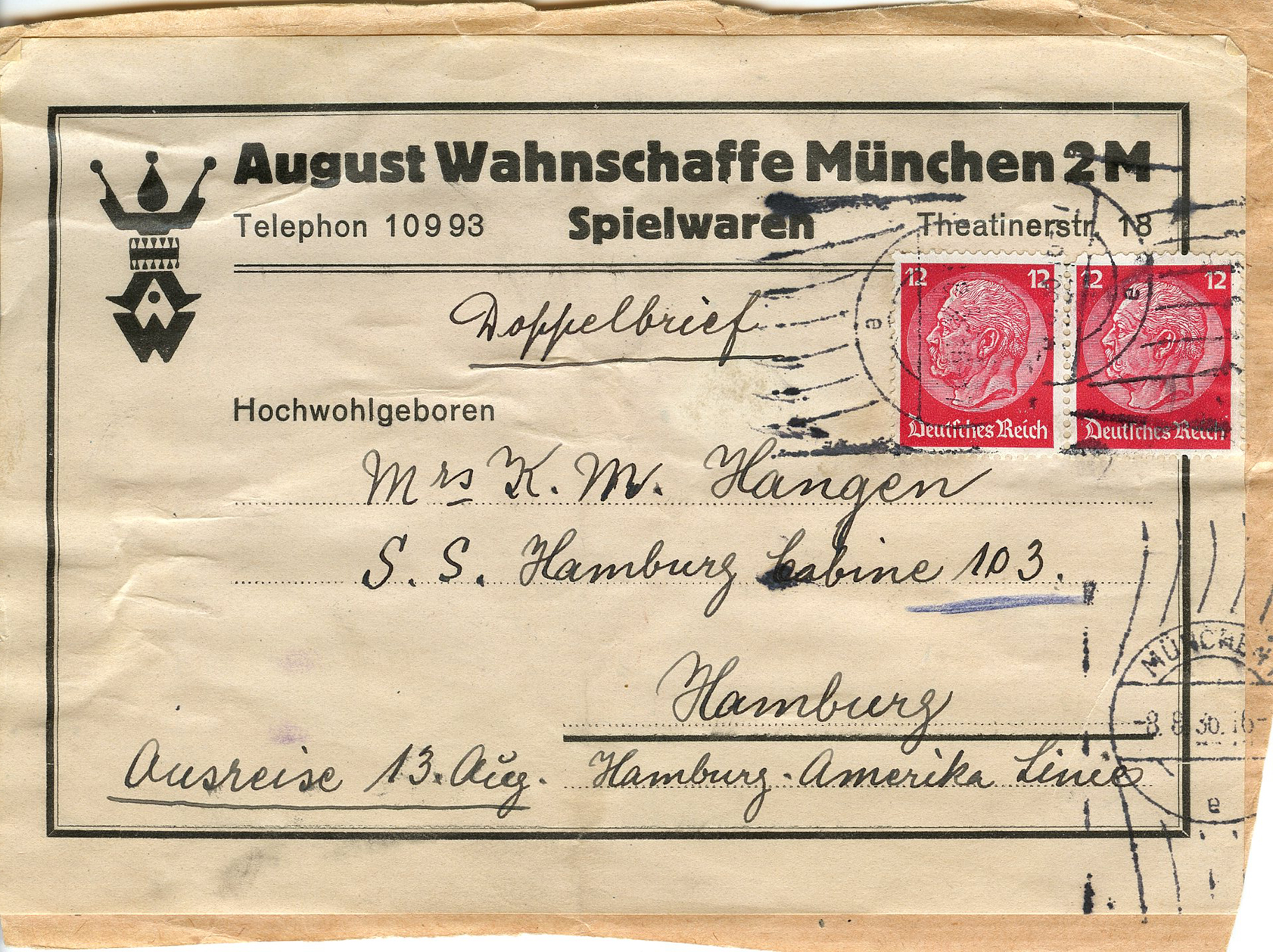 [Below: Another package front, except this one was sent to the 'S.S. Hamburg Cabine 103' of the 'Hamburg Amerika Linies', a large luxury cruise ship. This was postmarked on August 8, 1936 in Munich.]