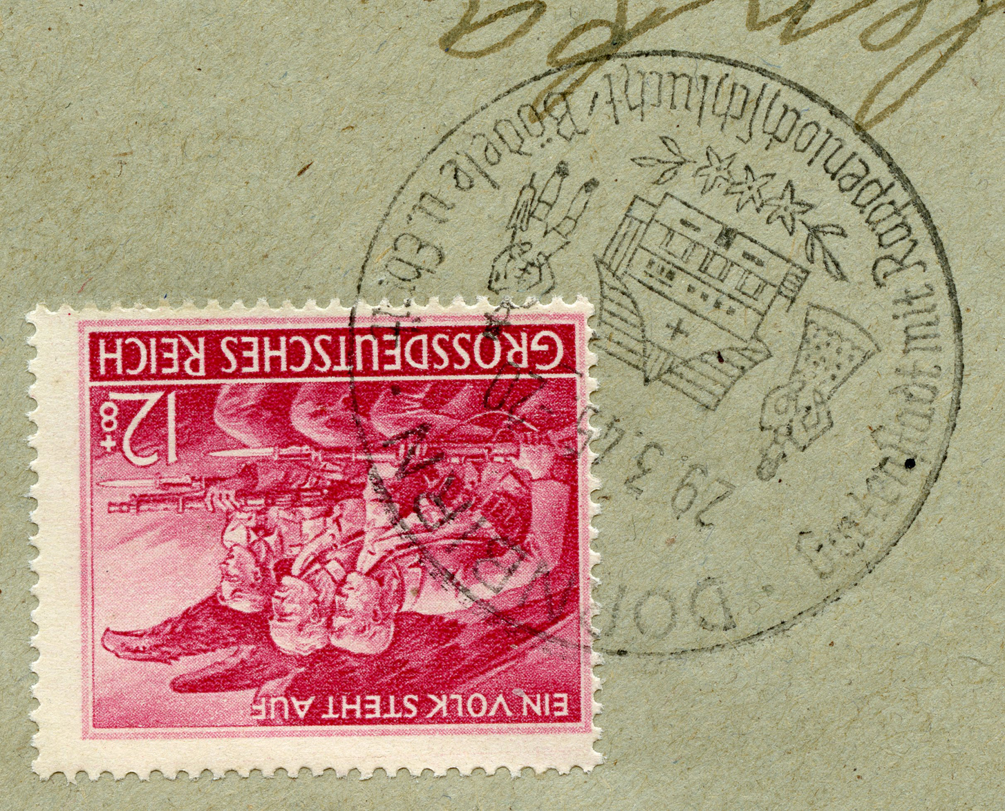 [Below: Here is a very special one, canceled close to the end of the war, on March 29, 1945. It has a rare vignette which says: