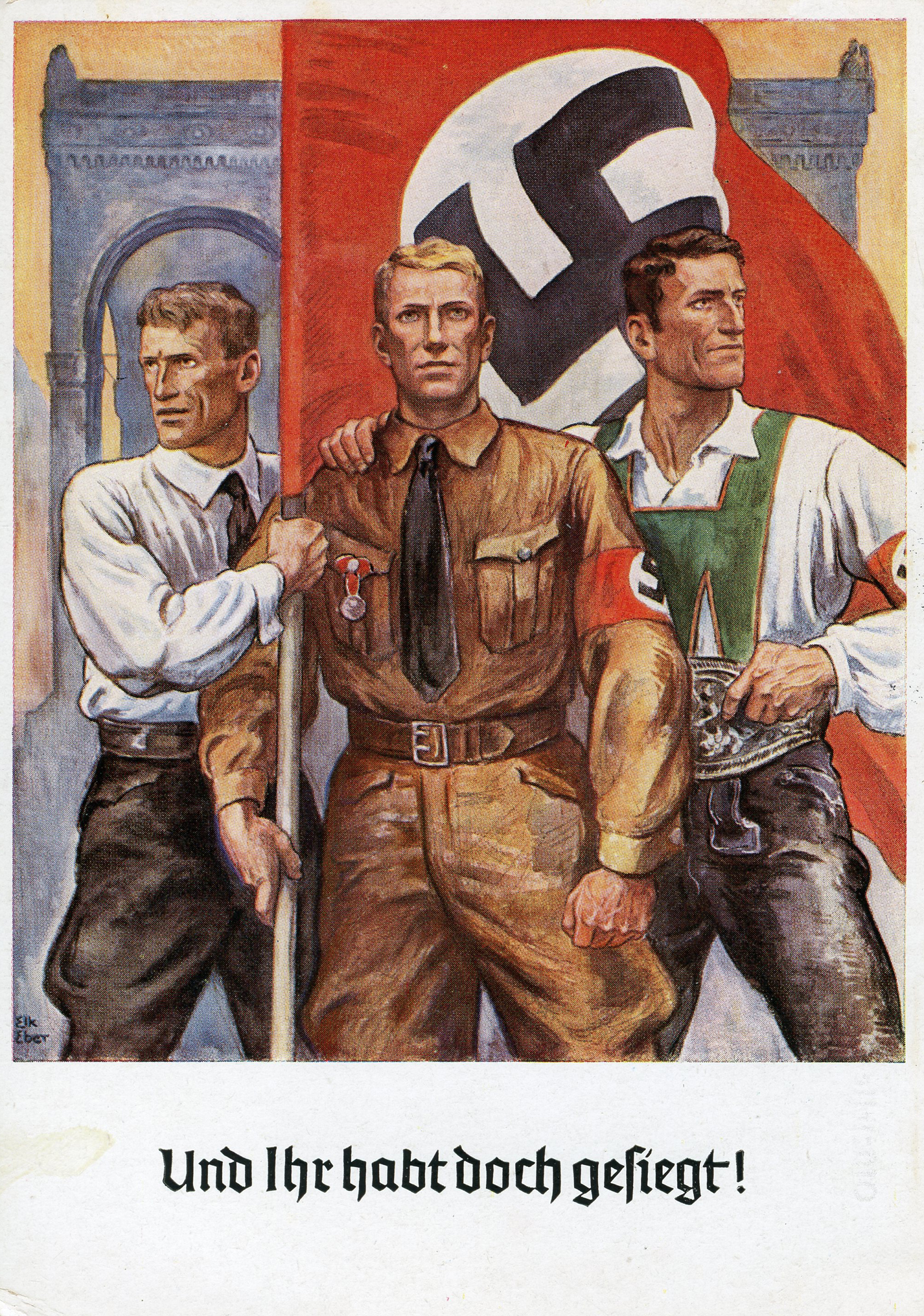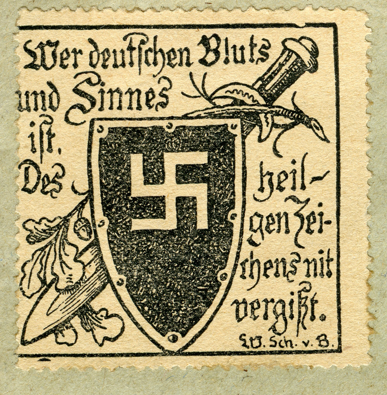 [Below: This is an extremely rare postcard. It sold for one Reich Mark which used for a donation to the NSDAP 1932 elections. It boldly proclaims 'Sell everything and buy a sword.' This phrase originates from the Gospel of Luke (22:36), where Jesus says "sell your cloak and buy a sword".]