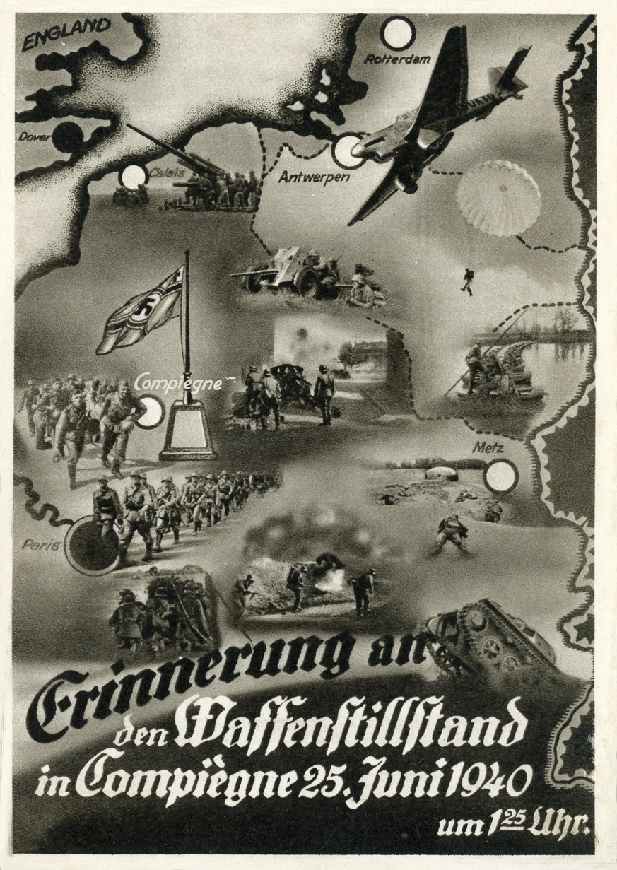 [Below: This postcard commemorates the fall of France to the Germans. It says: