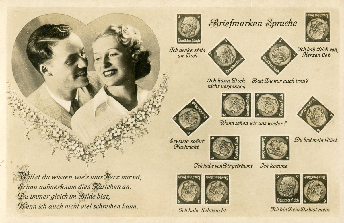 [Below: This shows the messages that could be relayed using the positioning of postage stamps. Click to enlarge.]