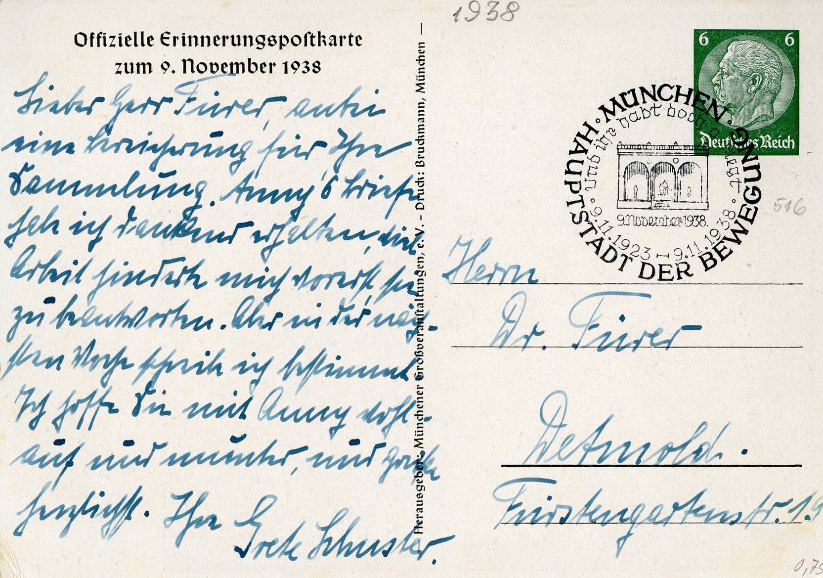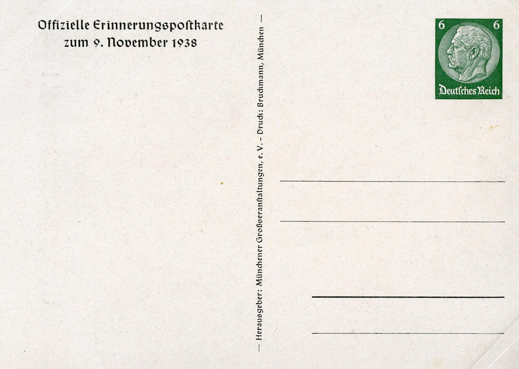 [Below: Reverse. (left) This says: 'Offizielle Erinnerungspostkarte zum 9. November 1938' (Official commemorative postcard for November 9, 1938). (left) Used with special event cancel. Click to enlarge.]