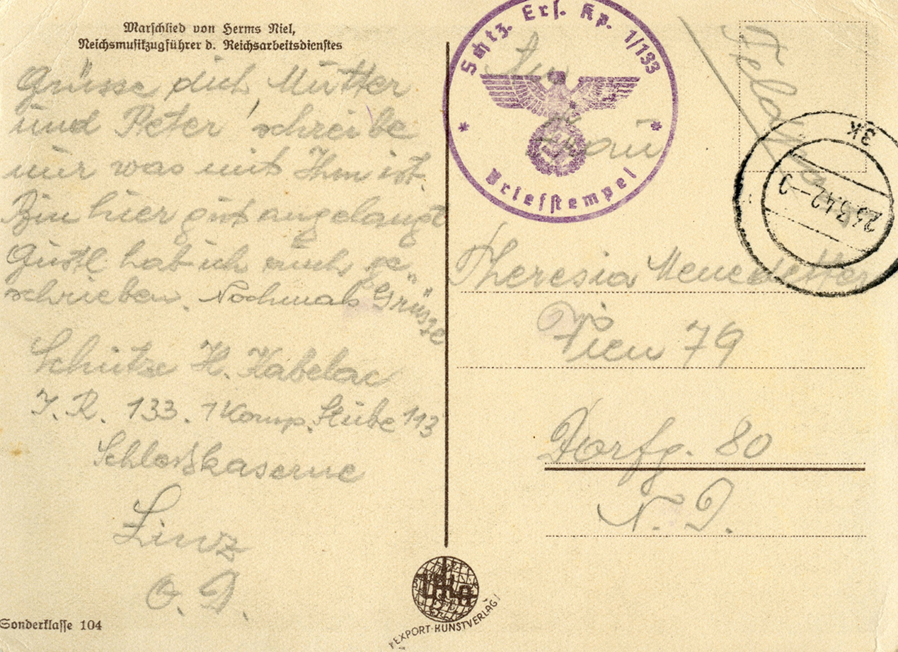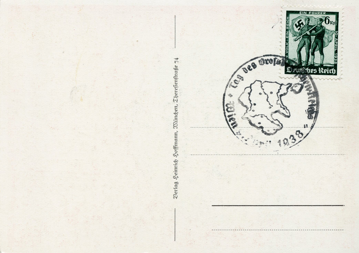 [Below: Reverse. This shows an Anschluss postmark and postage stamp. Click to enlarge.]