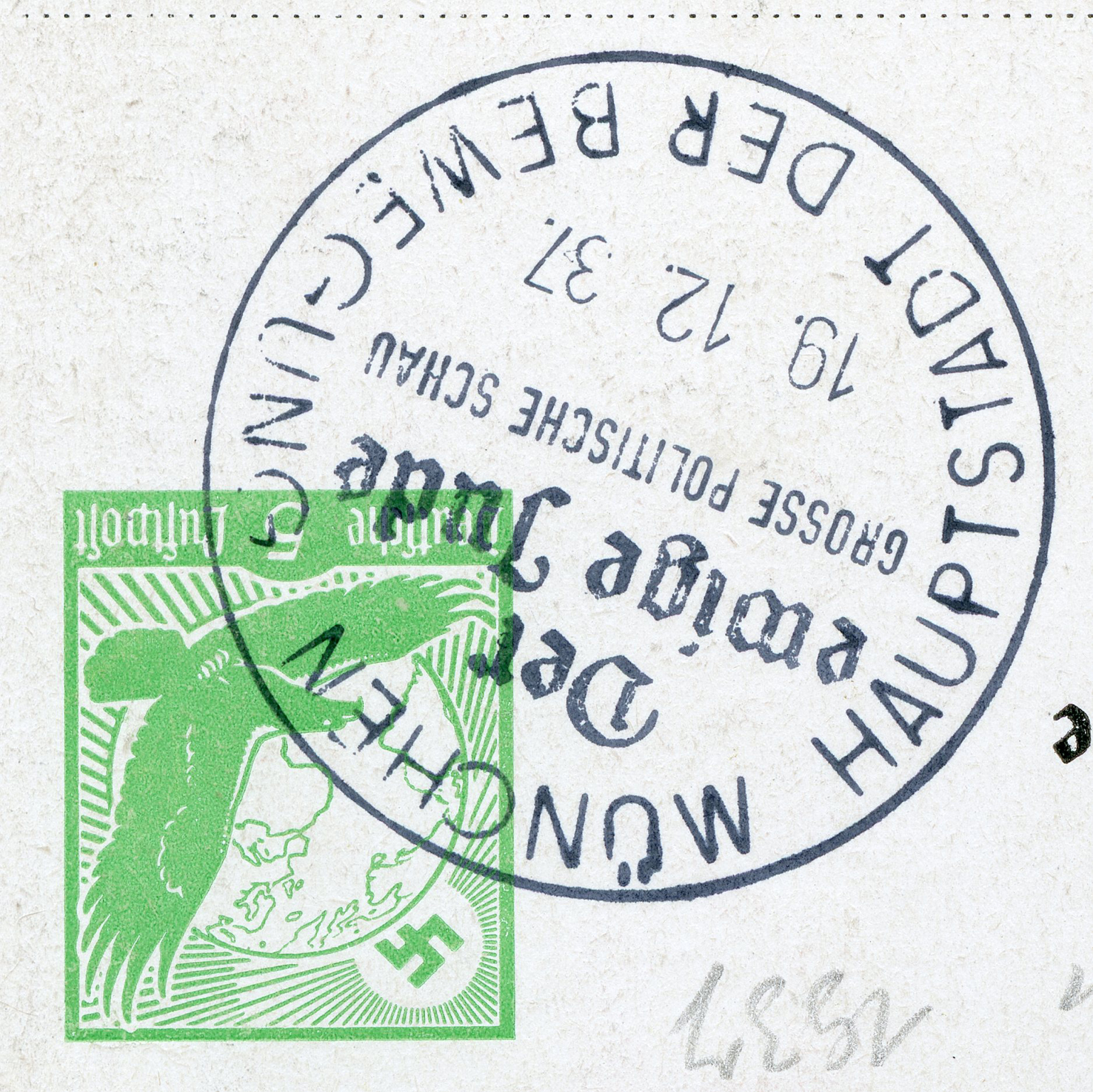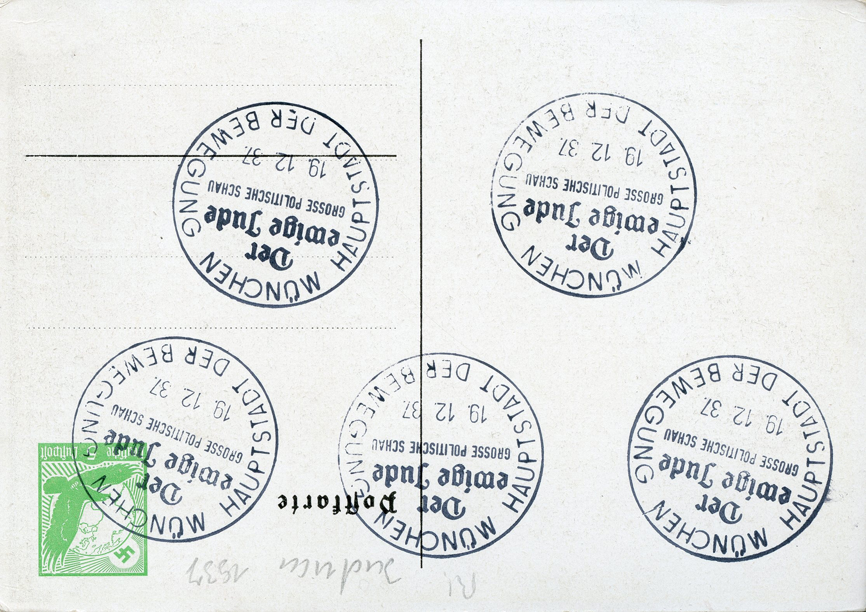 [Below: Reverse. Special Eternal Jew postmark from December 19,1937. This has a pre-paid airmail stamp as well. Click to enlarge.]