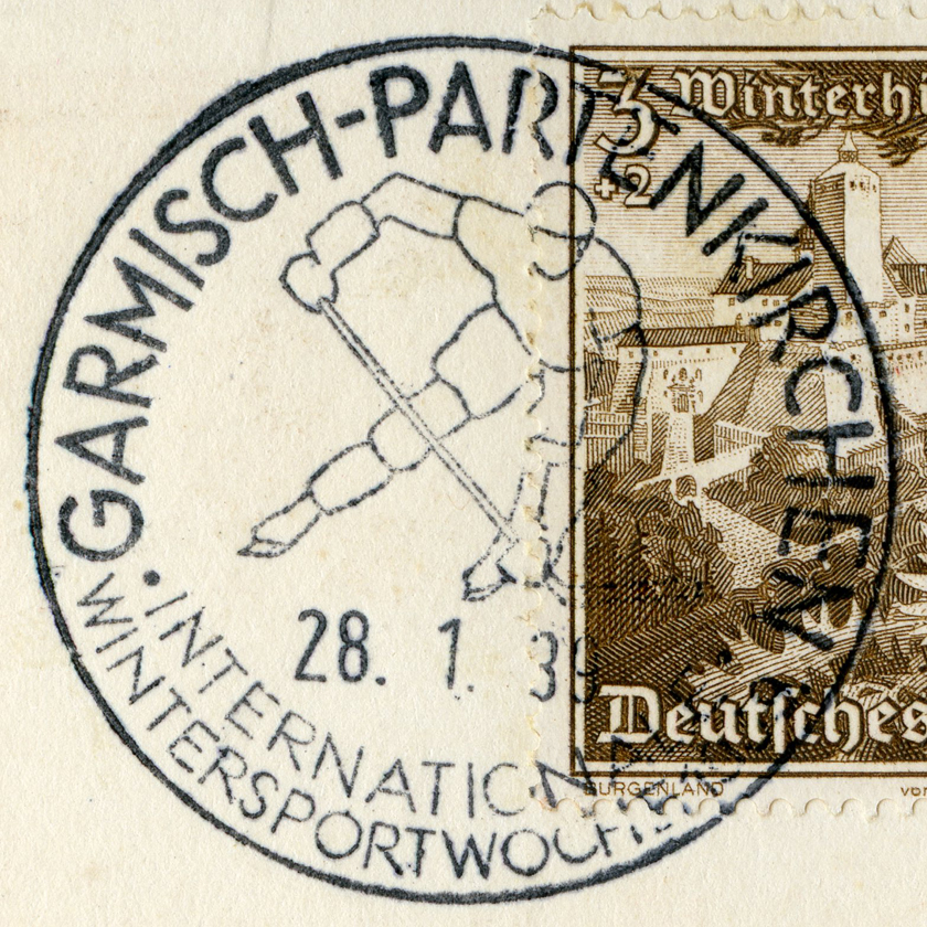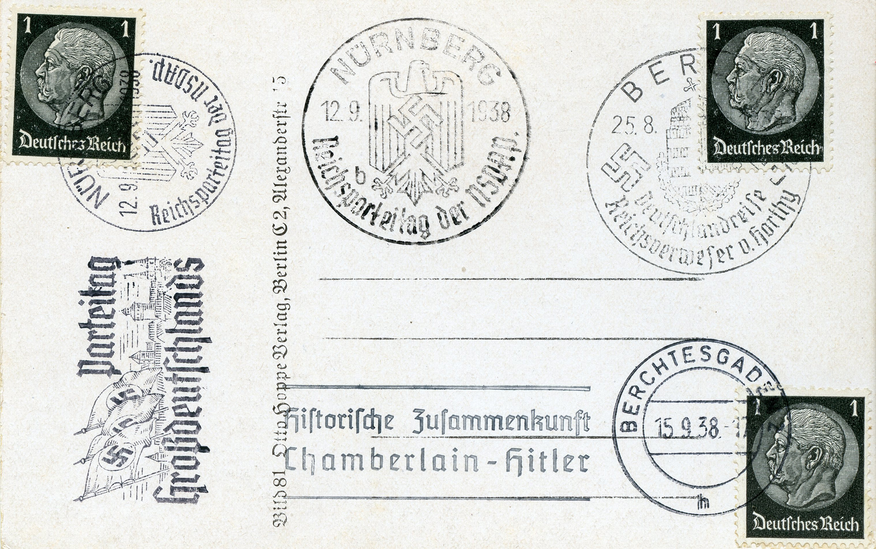 [Below: Close-up. This is a special postmark, it says: 'Historische Zusammenkunst Chamberlain - Hitler' (Historical collaboration Chamberlain - Hitler). Click to enlarge.]