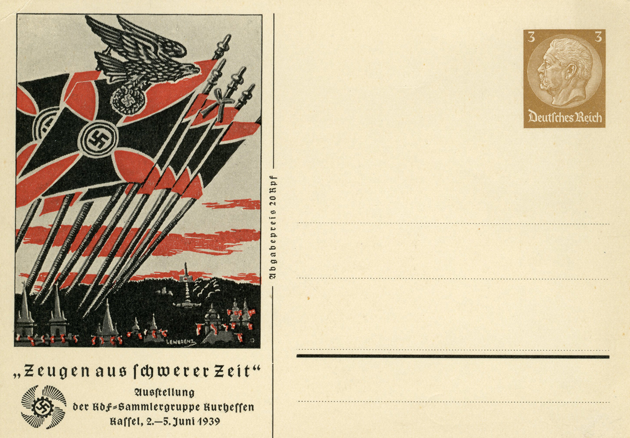 [Below: This is a neat-looking 'Kraft durch Freude' (Strength Through Joy) postcard. In case you don't know, anytime you see the swastika here with the cog wheel around it and the other swastika in the form of rays of light you know it is Strength Through Joy, or KdF for short. This says 'Zeugen aus Schwerer Zeit' (Witnesses from difficult times). Click to enlarge.]
