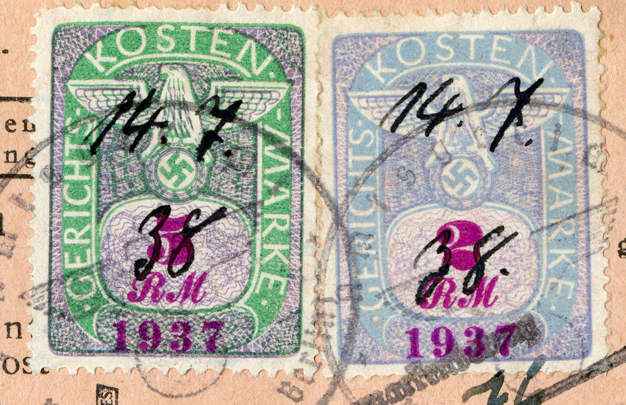 [Below: Now this is a strange postcard. I've never seen this type of postcard before. The stamps are court fees stamps, not postage stamps, which is interesting. As far as I can tell this has something to do with court fees. Click to enlarge.]