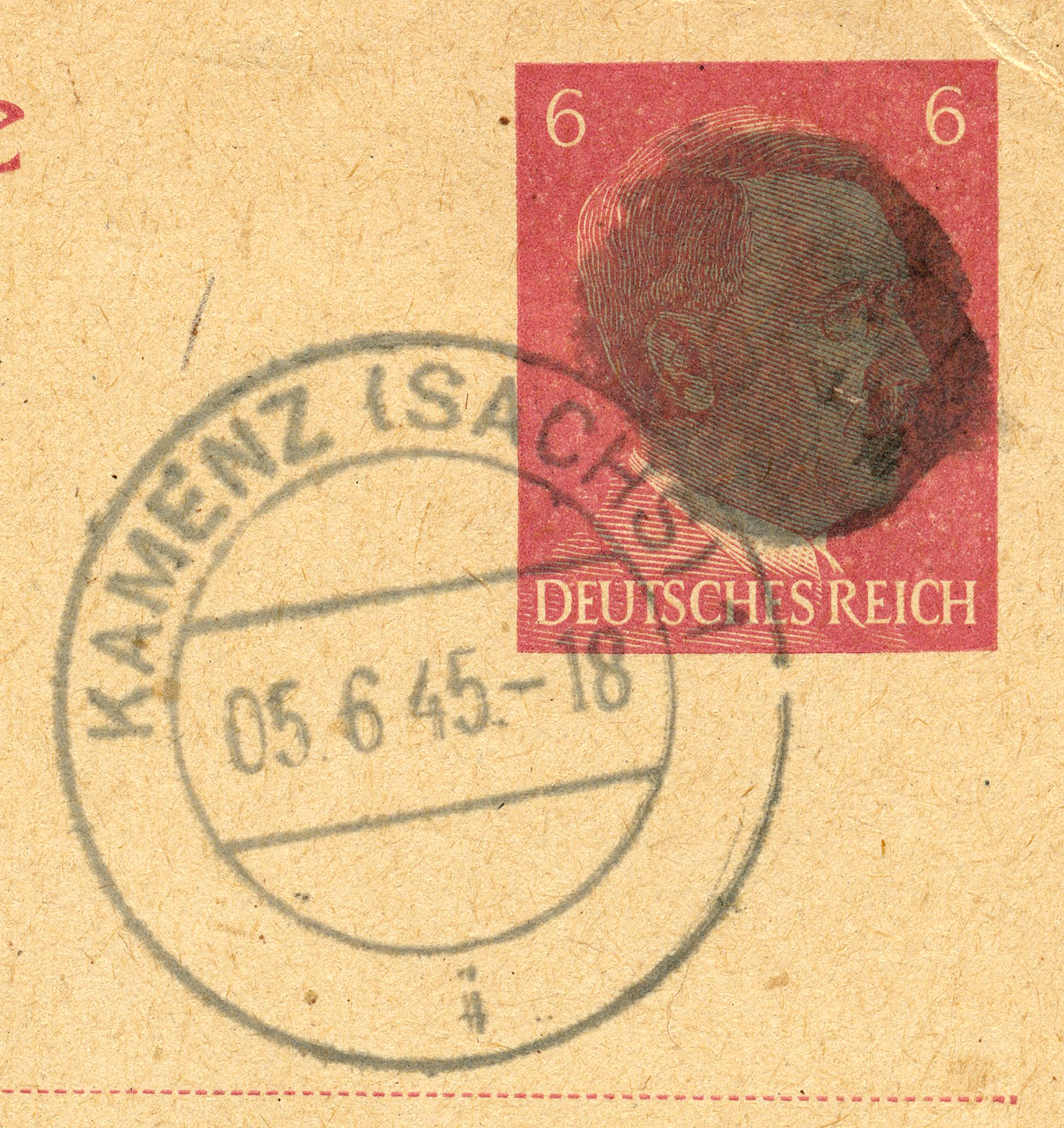 [Below: This handstamp Hitler blackout wasn't quite black enough so you can still see the forbidden face, and again they forgot to cover the quote. It was postmarked on June 5, 1945.]