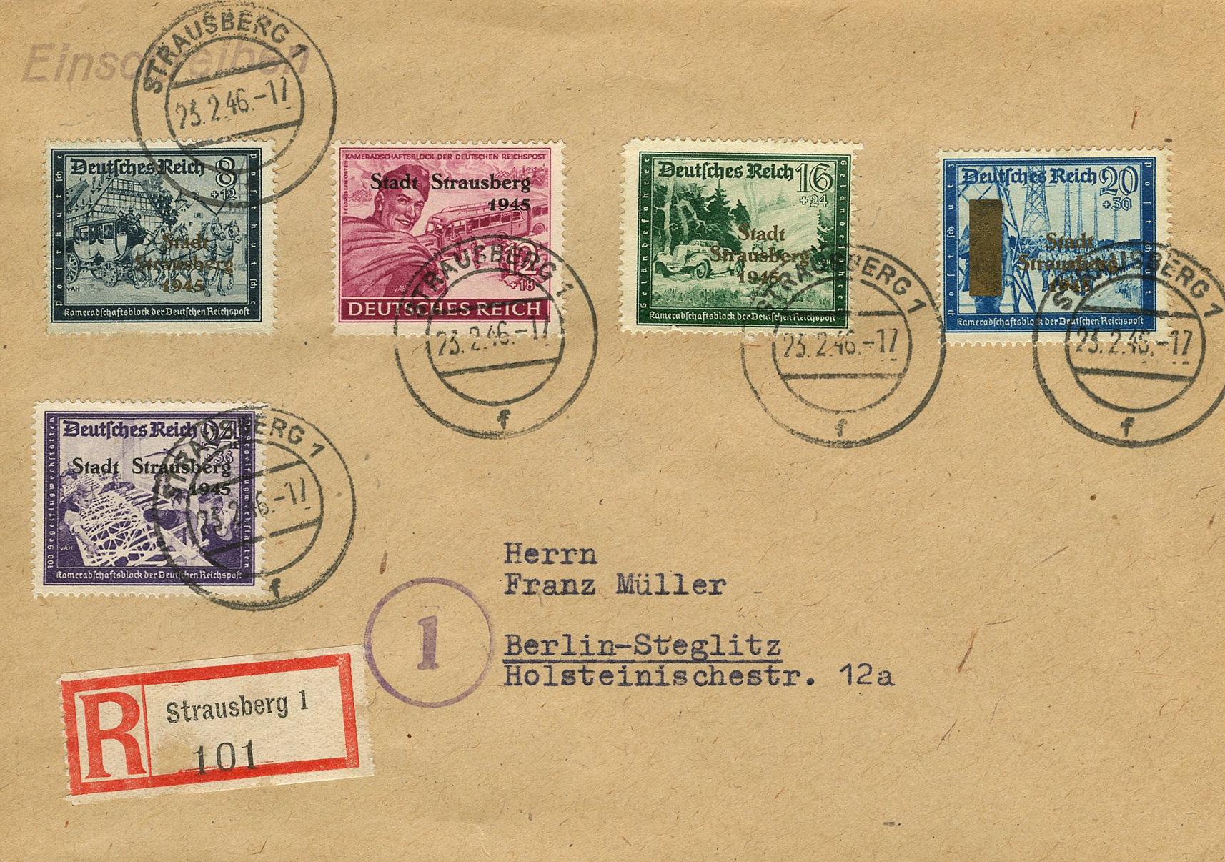 [Below: Hitler stamps weren't the only stamps the Allies tried to destroy, there were an array of verboten stamp designs. On the far right this has a postage stamp with a gold bar on it, which covers the image of a soldier. It was postmarked on February 23, 1946.]