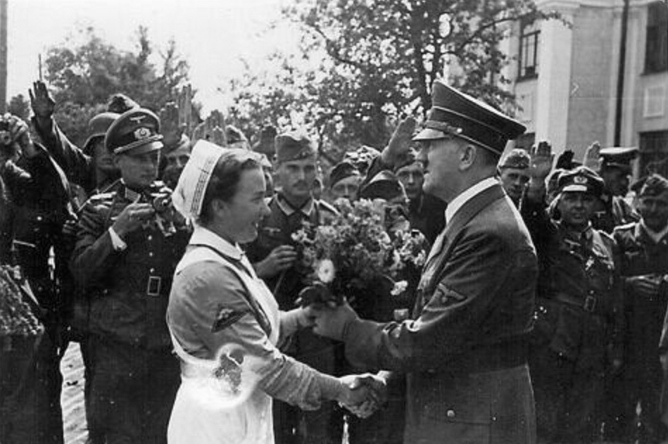[Above: Adolf Hitler visiting the wounded on a train.]