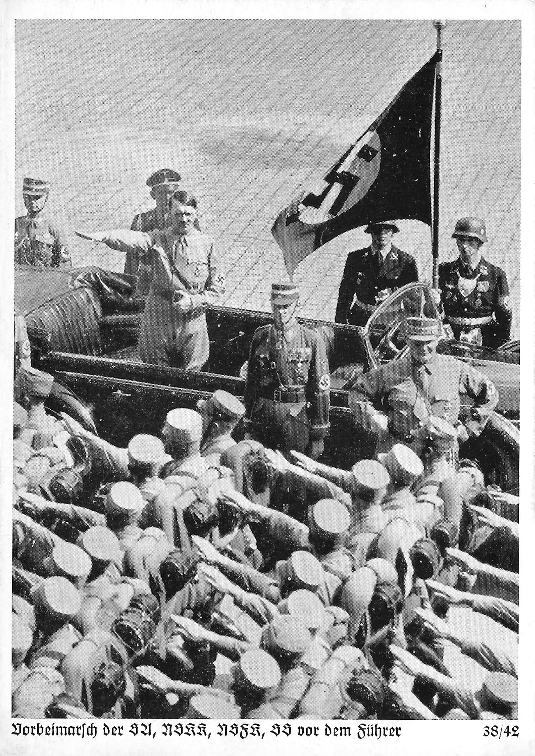 [Above: Viktor Lutze, Heinrich Himmler and Adolf Hitler, with thousands of SA men watching. Click to enlarge!]