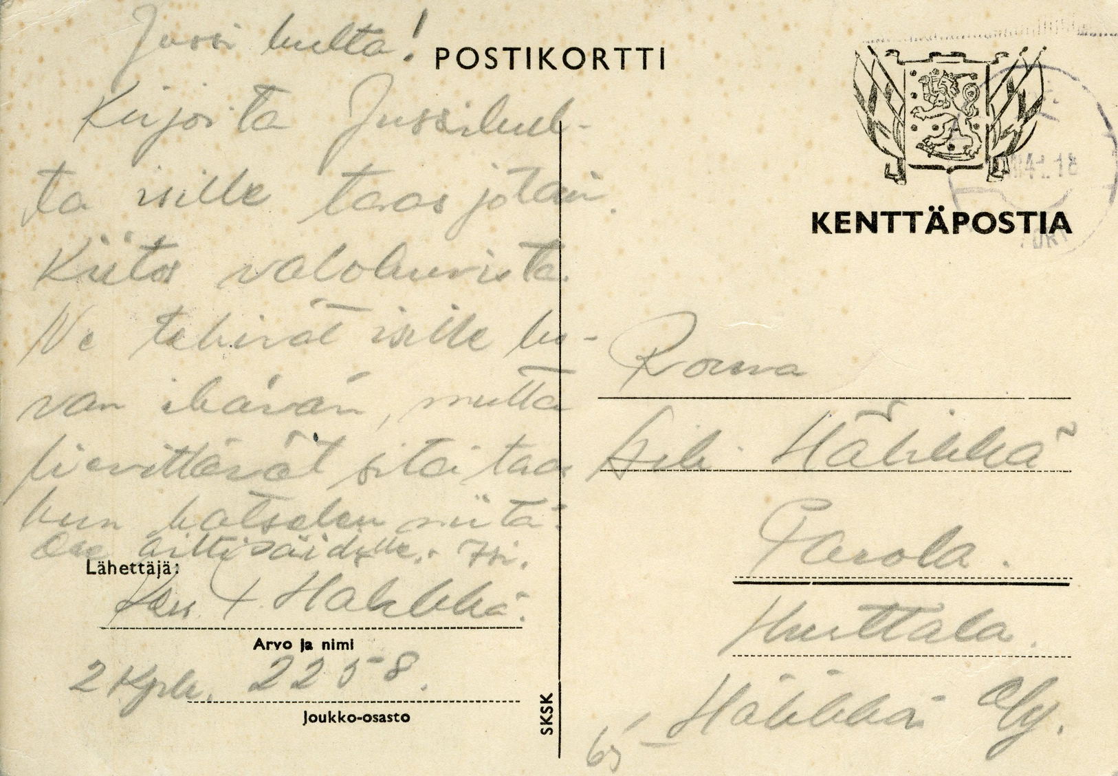 [Below: Finnish Feldpost postcard. The reverse is blank.]