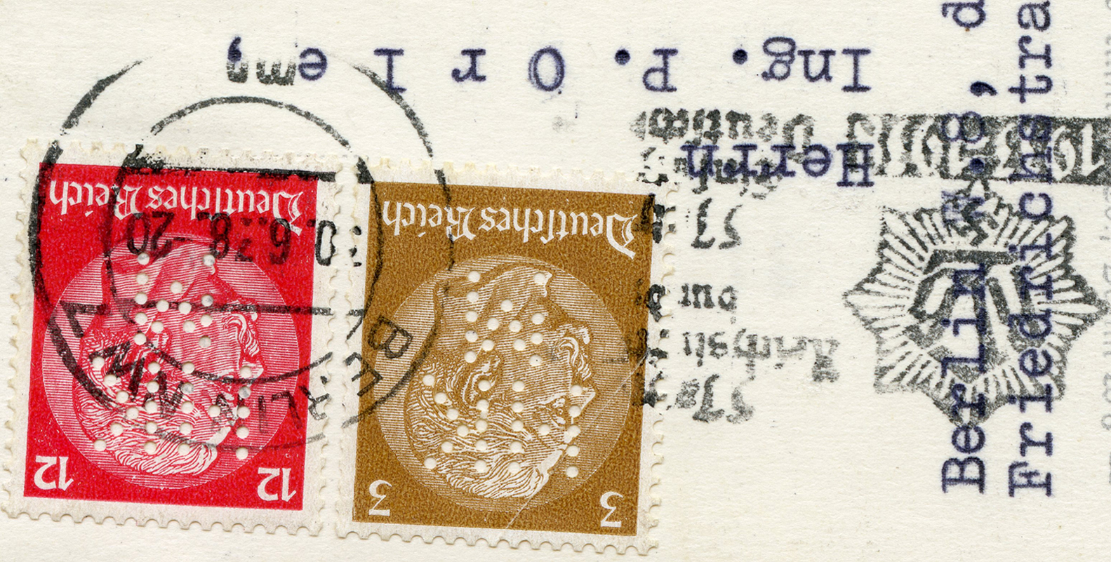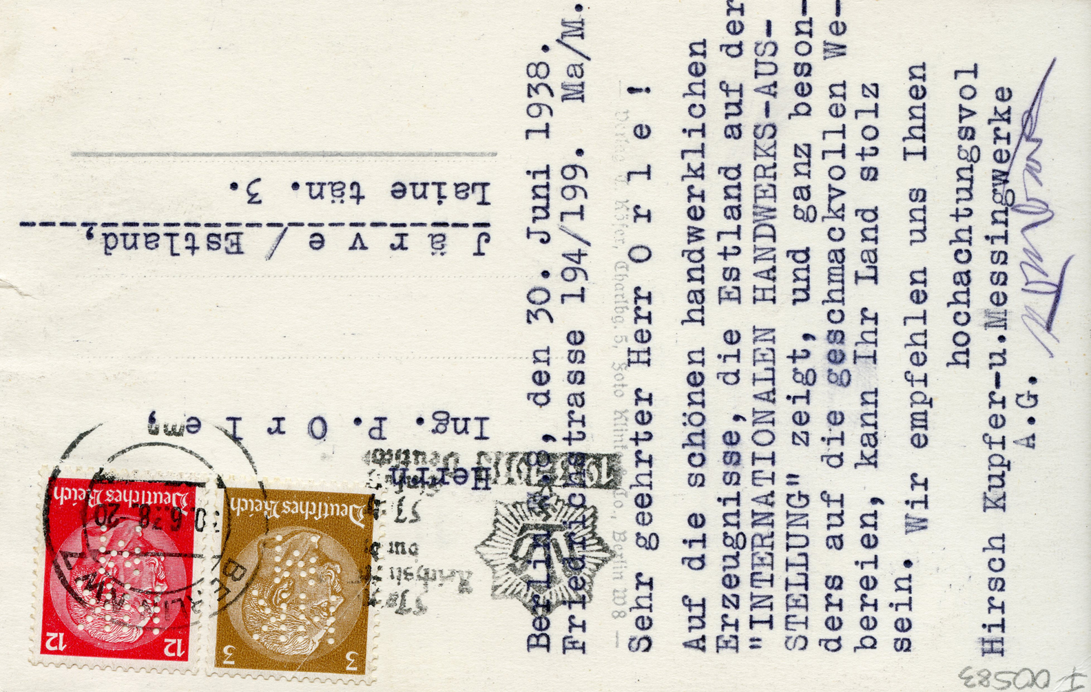 [Above: Reverse of postcard. This is canceled on June 30, 1938. Note that the postage stamps are perforated with the letters 'HKM', one reason businesses were allowed to do this was to prevent theft. Click to enlarge.]