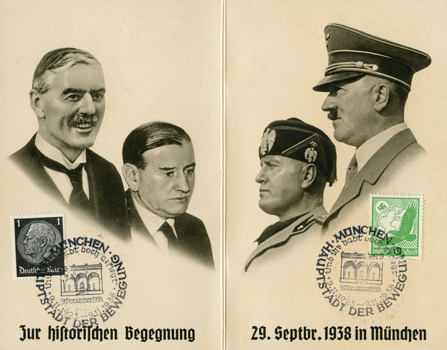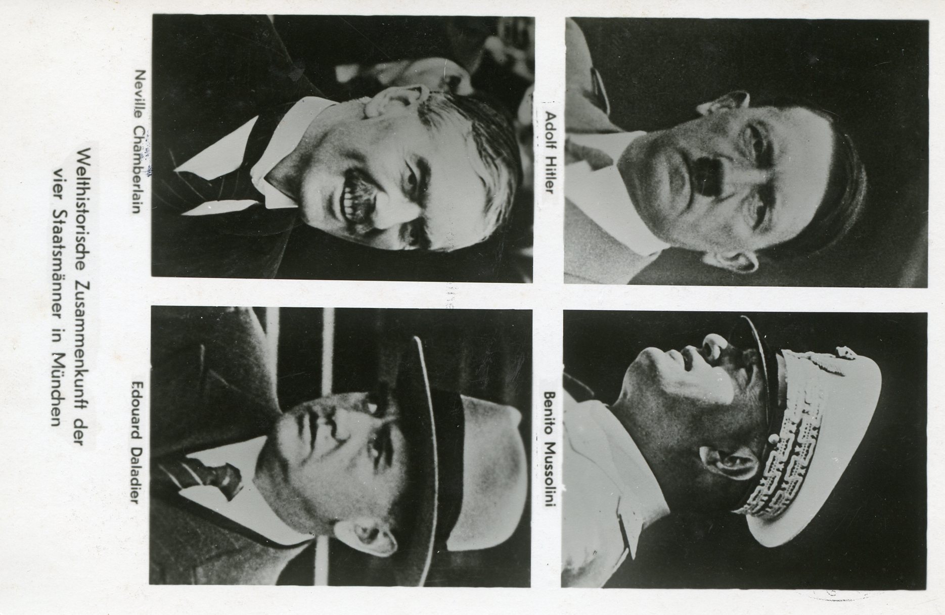 [Below: This is a pretty strange double postcard commemorating the September 1938 'Munich Agreement', a peace agreement between Germany, Great Britain, France, and Italy, which allowed Germany to annex the Sudetenland. The left side of the postcard shows the British Prime Minister Neville Chamberlain and the French Prime Minister Édouard Daladier. I don't think I need to tell you who the other two people are! Click to enlarge.]