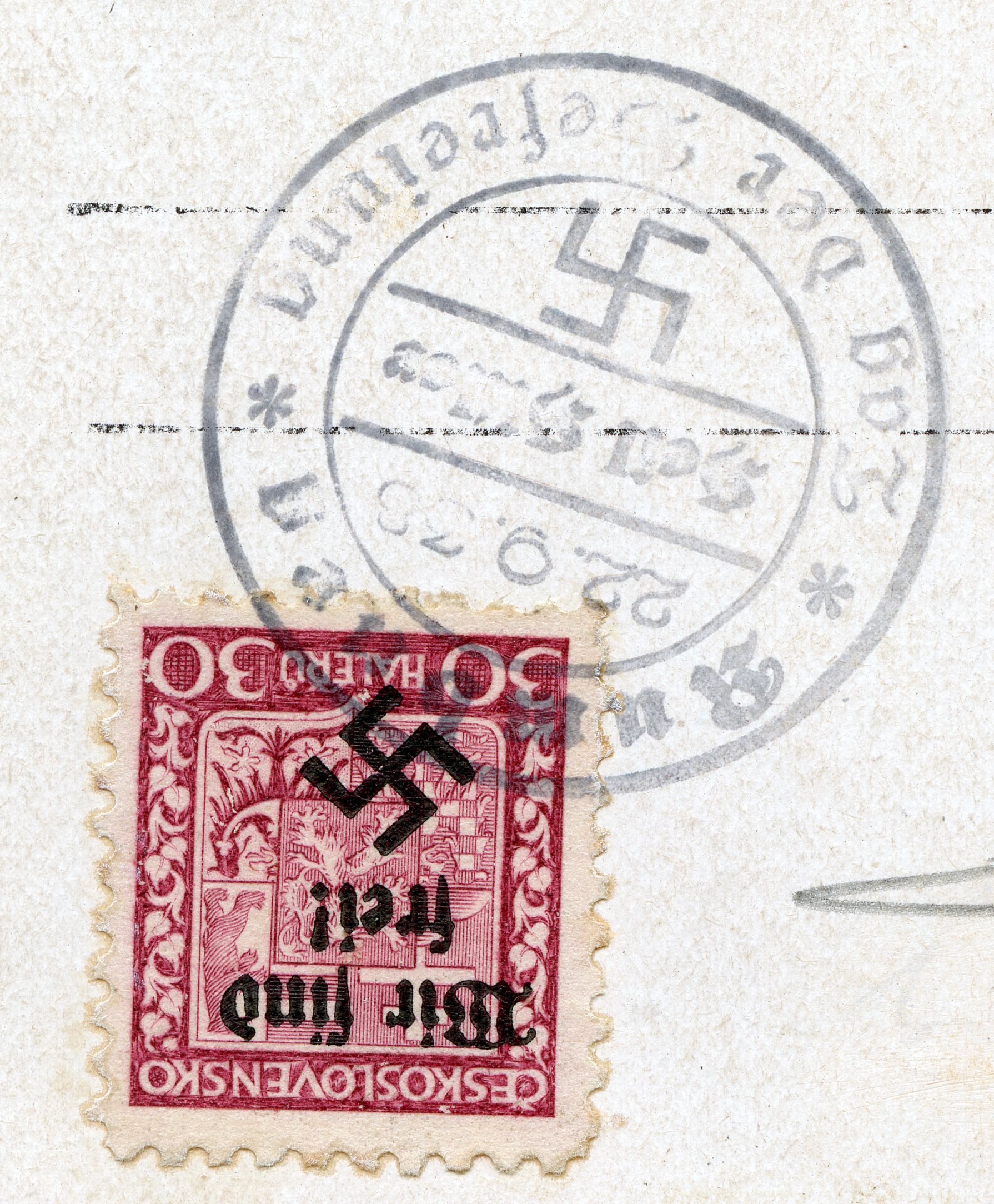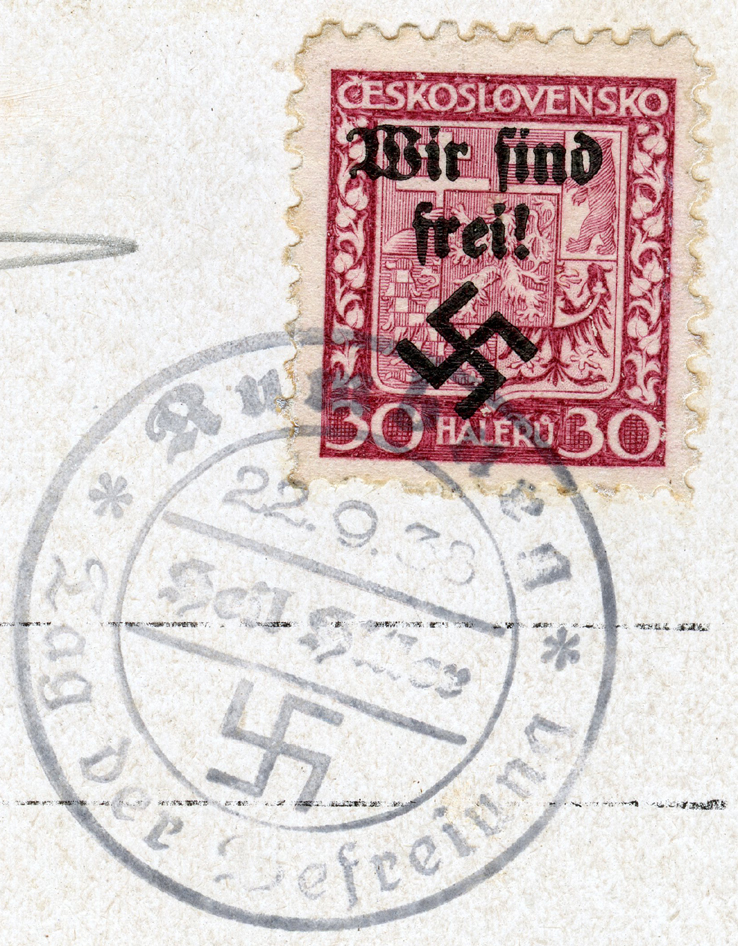 [Below: This is a Sudetenland overprint from September 22, 1938, when it rejoined Germany. This type of overprint is from Rumburg, Sudetenland. It is also canceled Rumburg. Click to enlarge.]