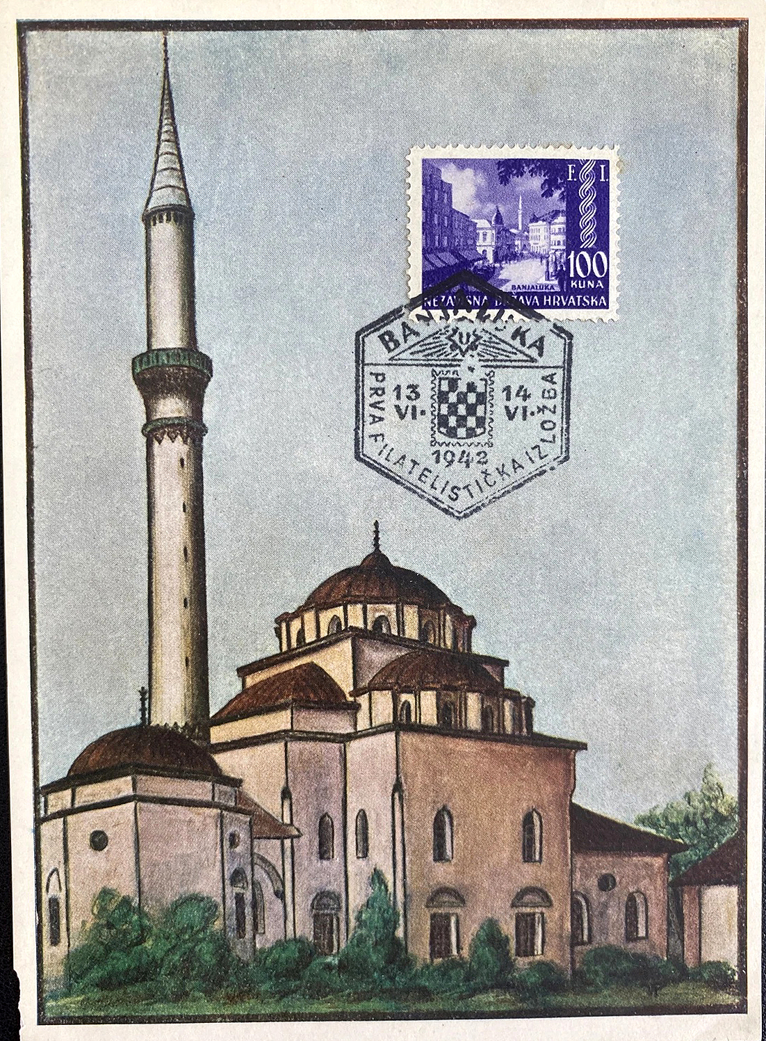 [Above: Postcard of Banja Luka (city in Bosnia and Herzegovina) postage stamp exposition. In the center is a picture of Pavelic and on either side of his portrait are framed postage stamps.]
