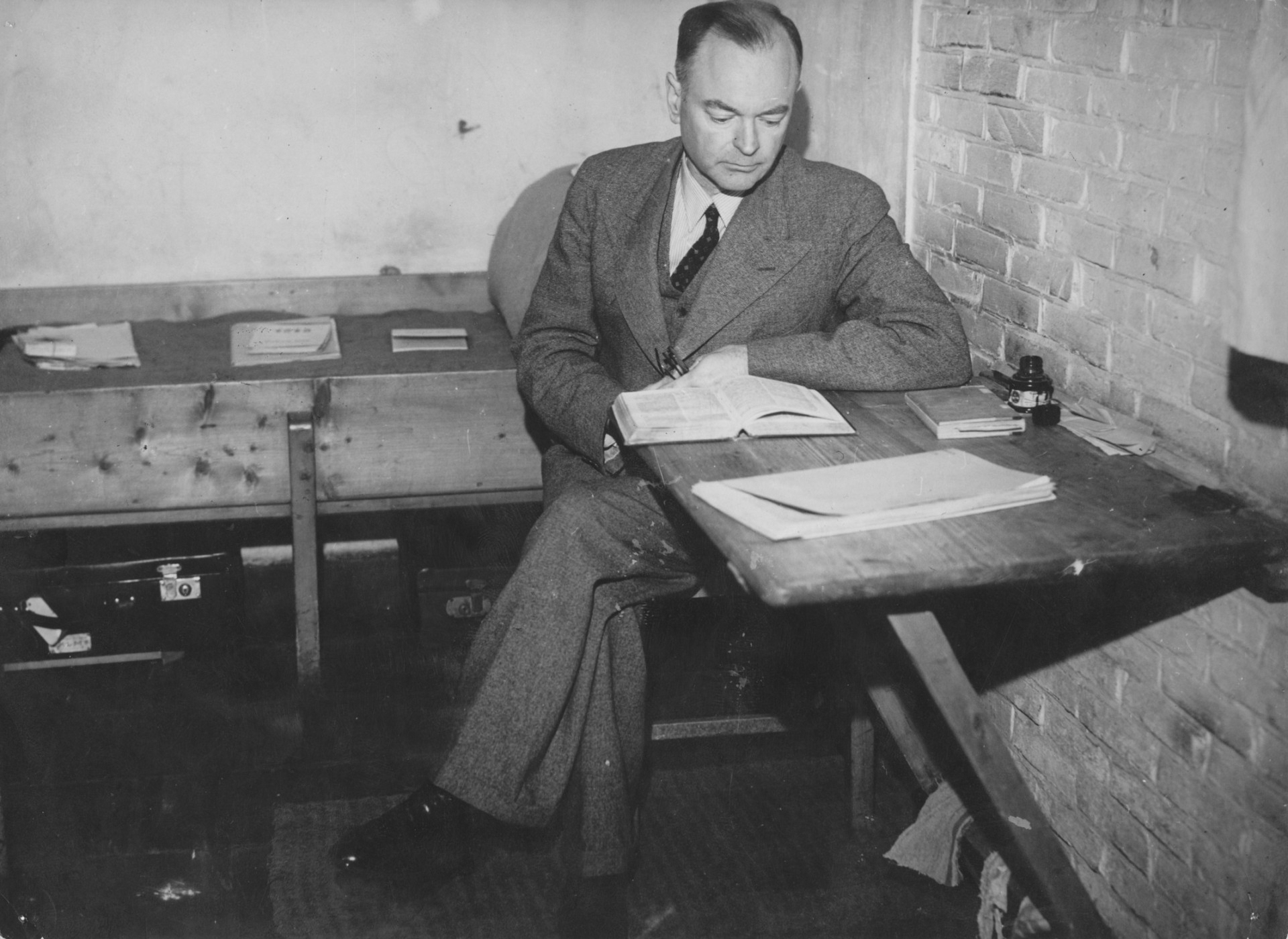 [Below: Anton Mussert reading in his cell. Click to enlarge.]