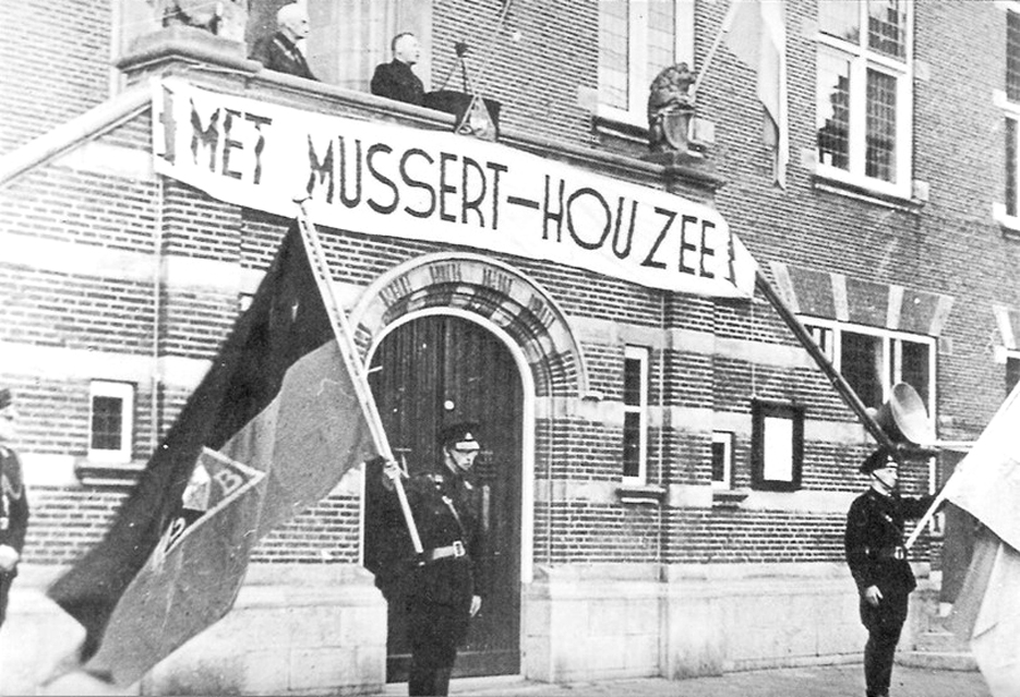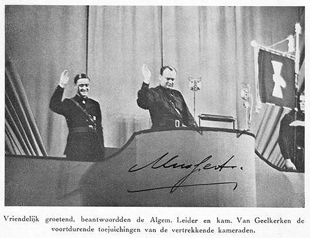 [Below: 'Met Mussert Voor Volk En Vaderland' = 'With Mussert for Folk and Fatherland'.]