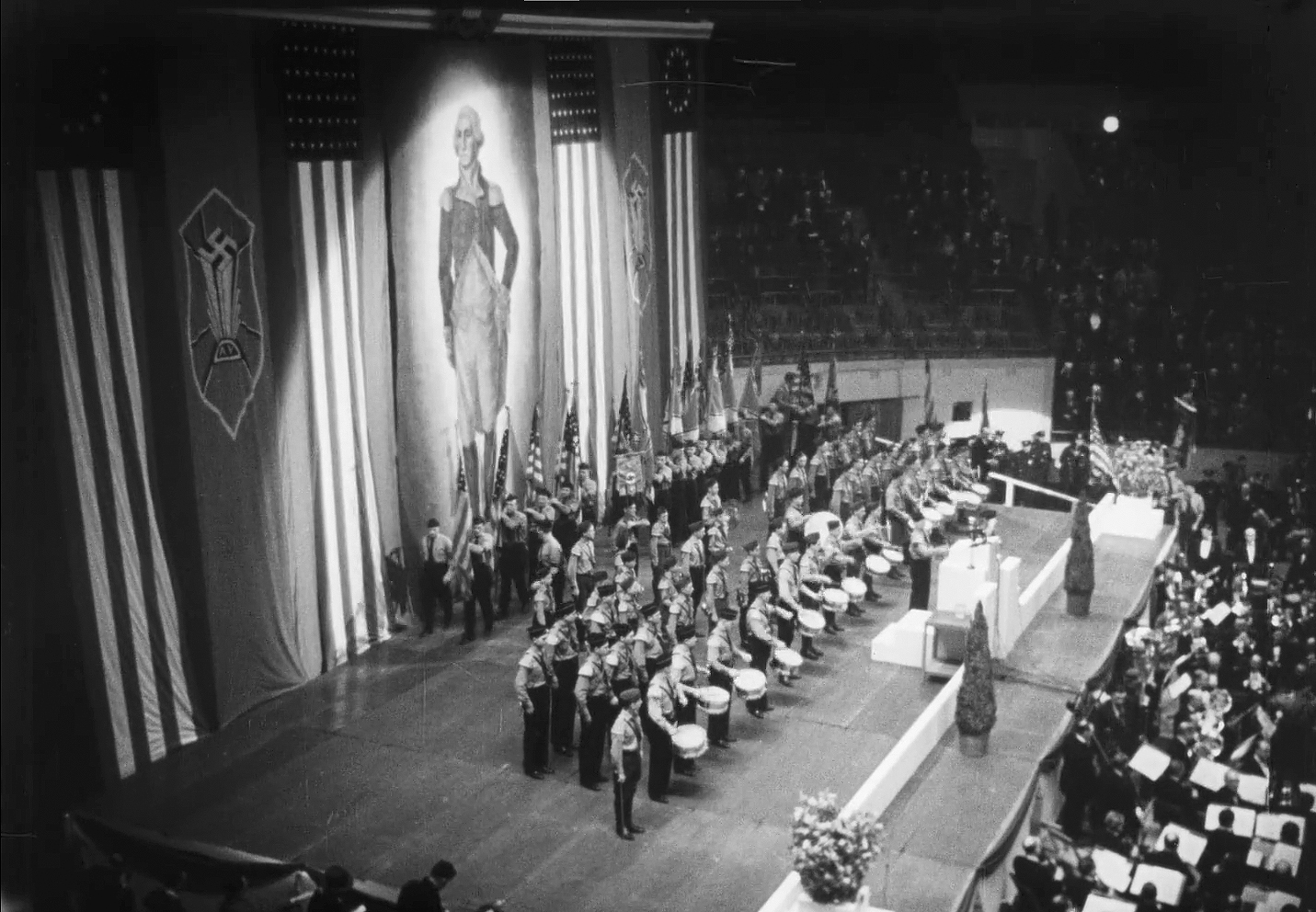 [Above: Bund leader Fritz Kuhn speaking at the event] [Above: Bund leader Fritz Kuhn watches as a communist gets neutralized]