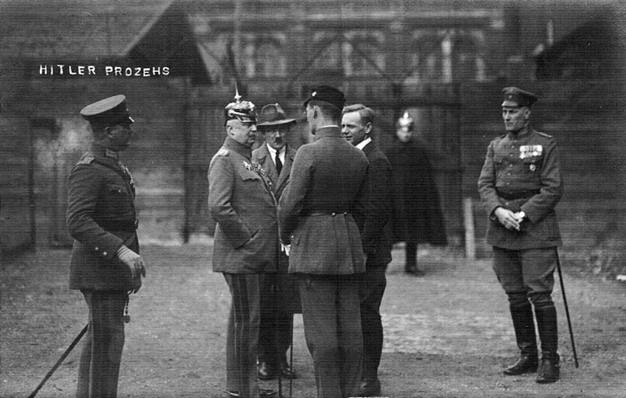 [Above: Ludendorff, Hitler, Frick, Röhm with other early National Socialists and German nationalists, April 1, 1924, awaiting the verdict announcement in the Hitler-Ludendorff Beer Hall Putsch trial in Munich.]