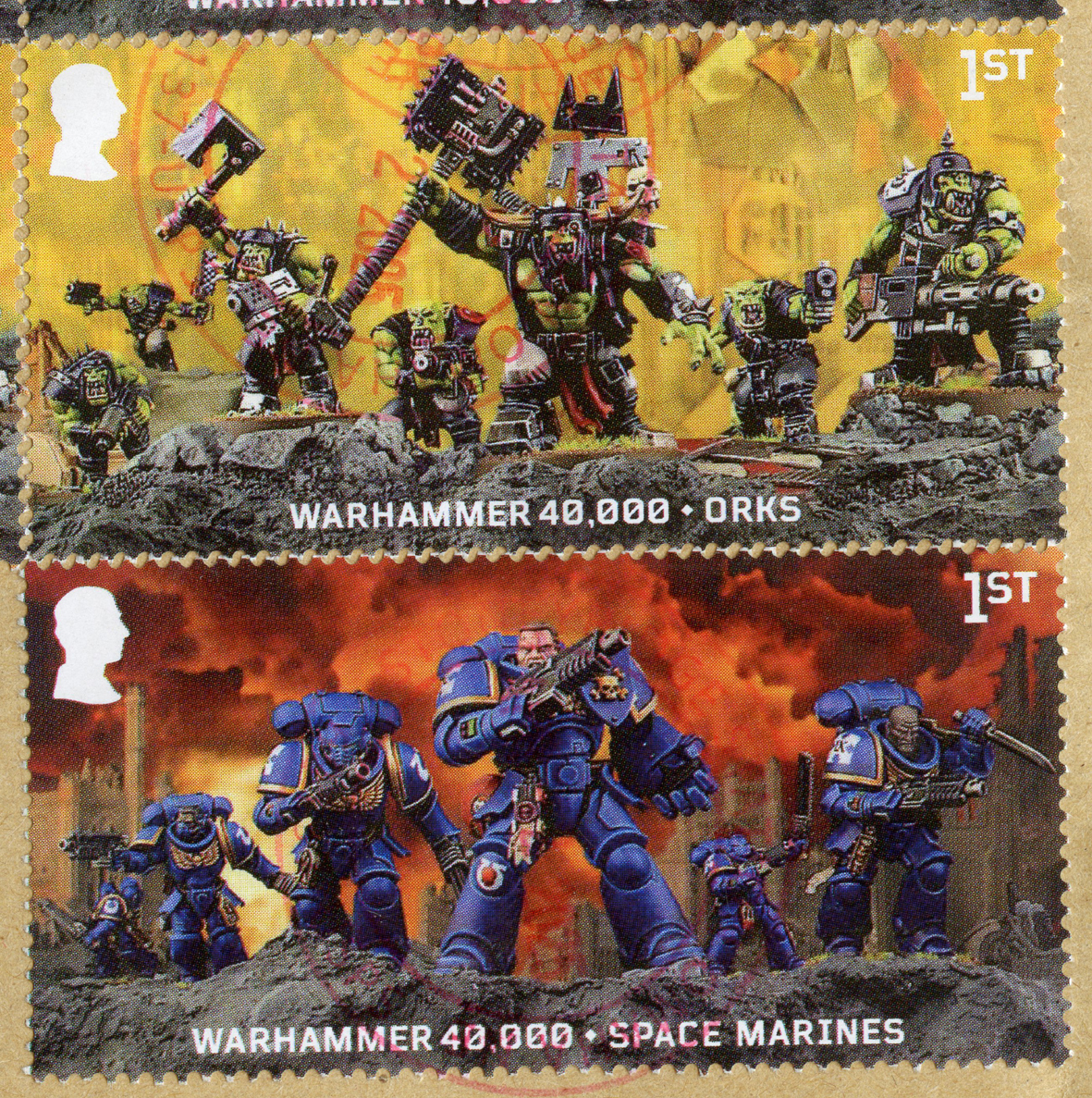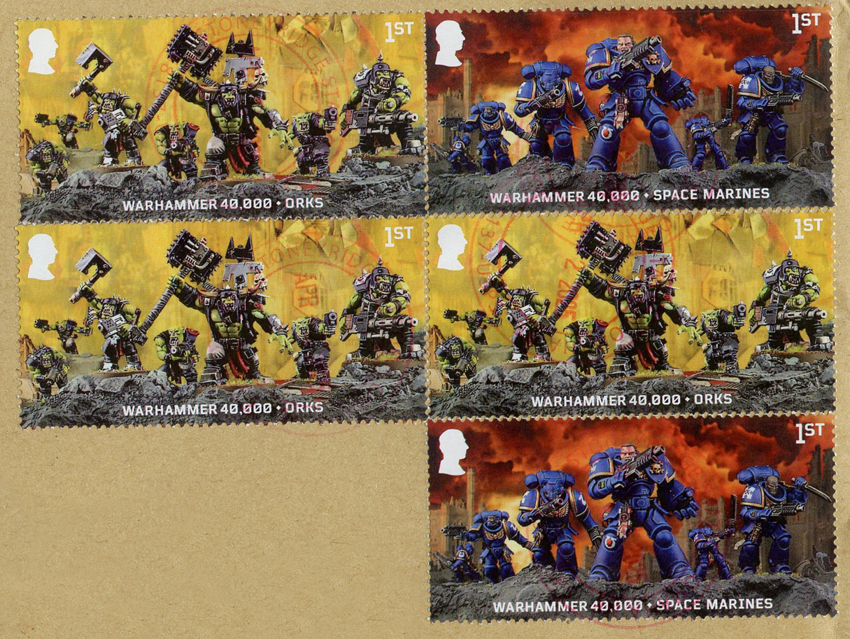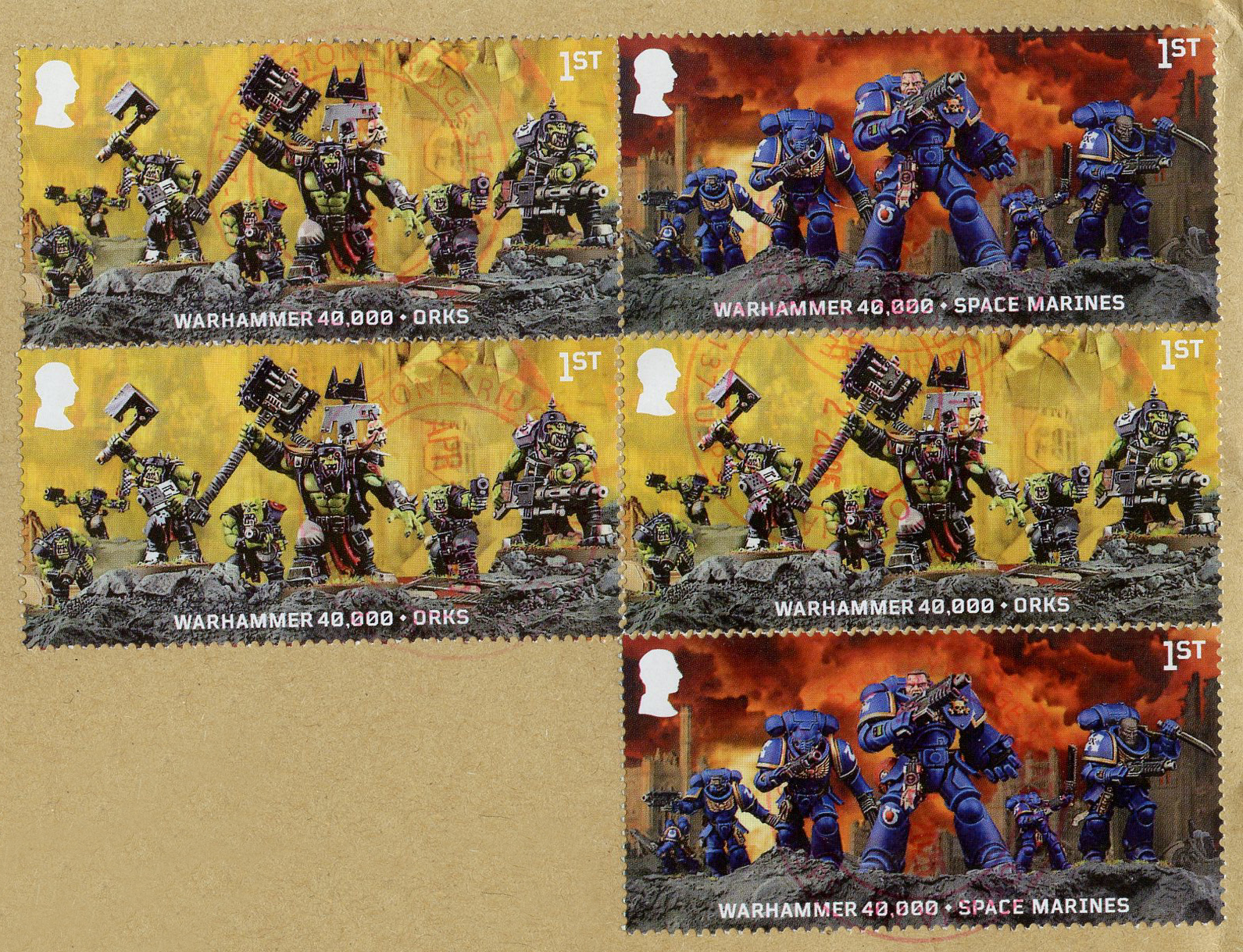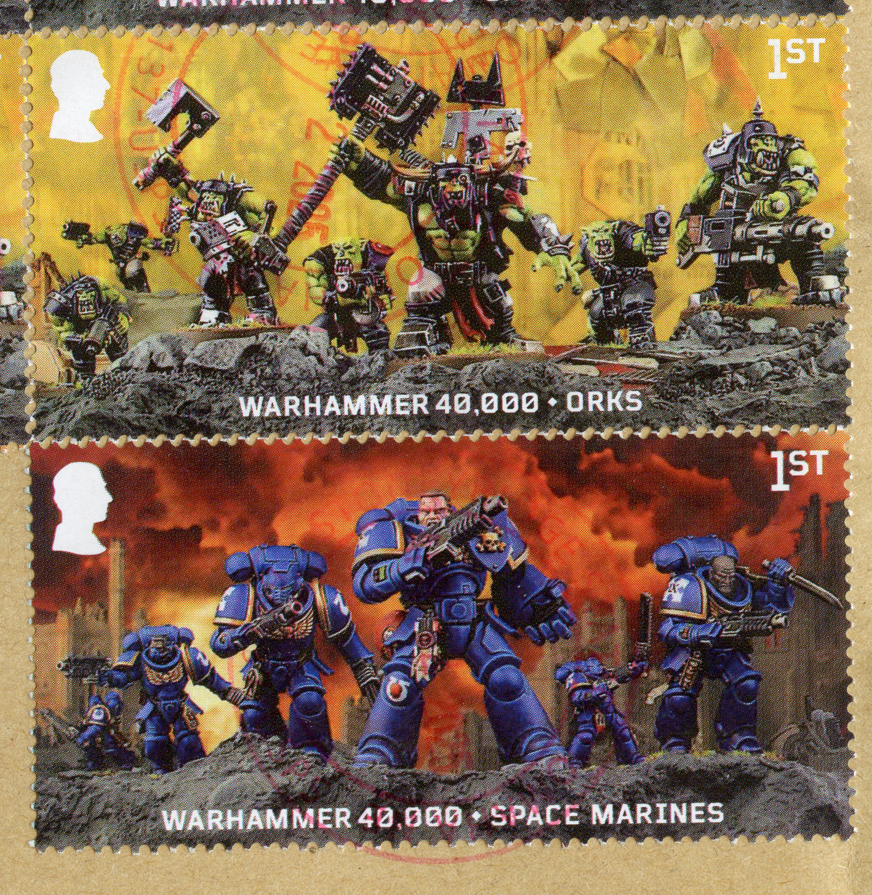 [Above: Not to be outdone, England released a set of Warhammer stamps. Like Dungeons & Dragons Warhammer has been turned into politically correct cesspool.]