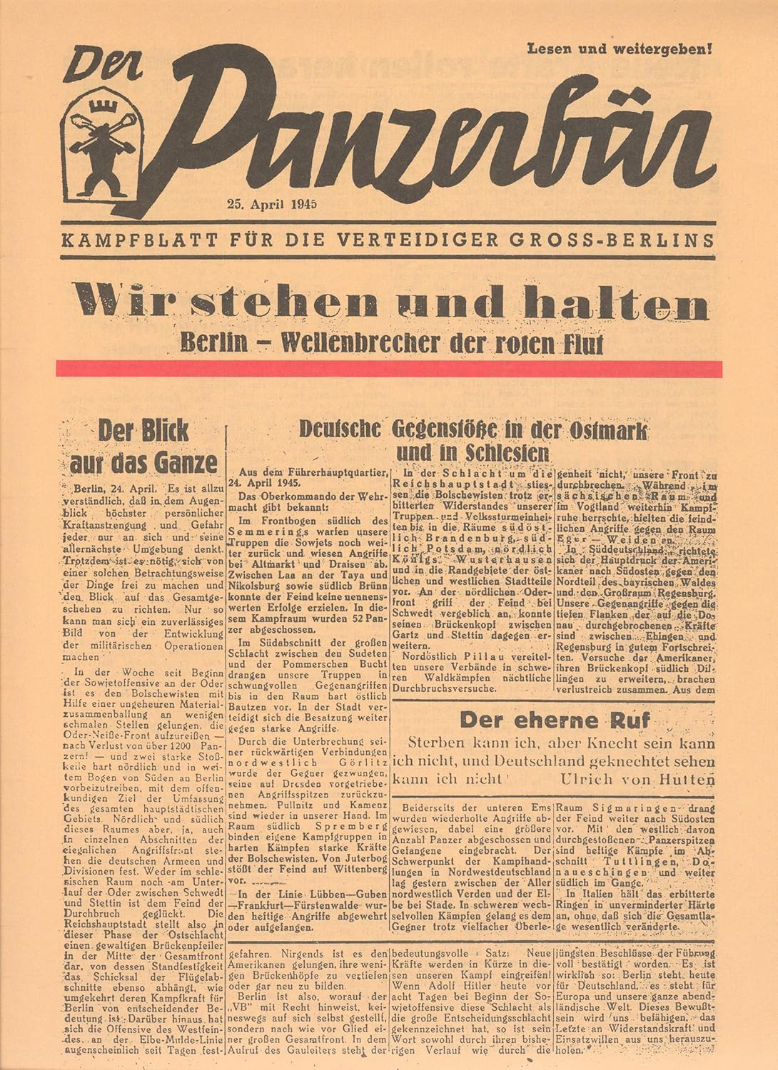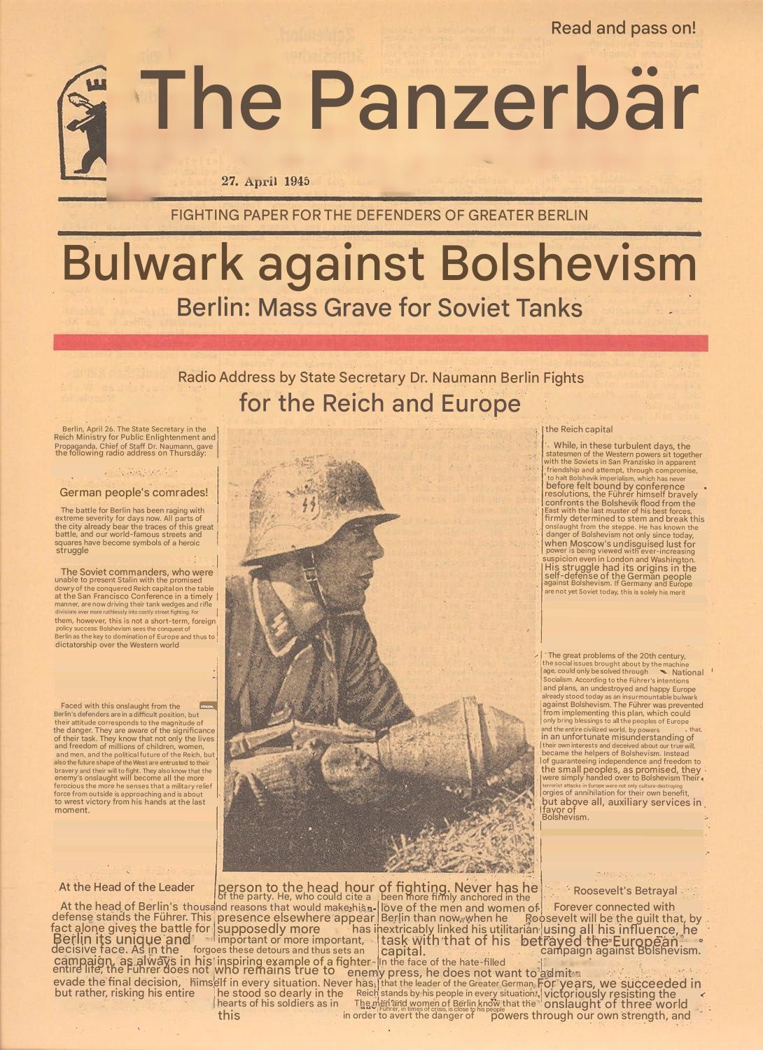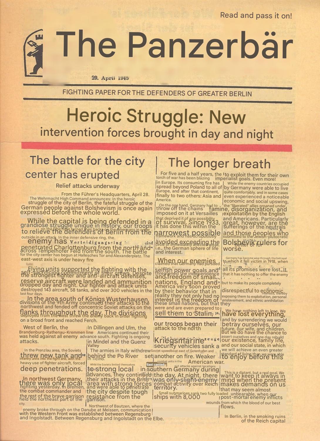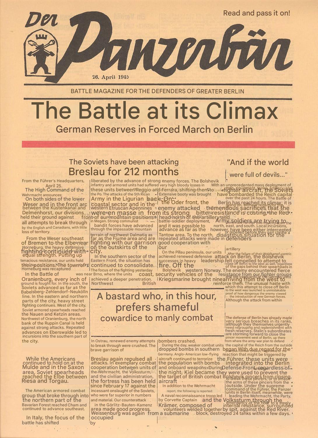 [Below: Okay, now to Panzerbär (Armored Bear). This was a newspaper from the final days of Berlin for the doomed defenders of Europe. It ran from April 22 - April29, 1945 (eight issues). Note the bear has a Panzerfaust and a shovel in its hands. The bear is the age old symbol of Berlin. To a National Socialist, this newspaper is poetic, sad and beautiful. Heroic in the face of death. Needless to say, it is quite rare. Here is a sampling and a crappy translation of each.]