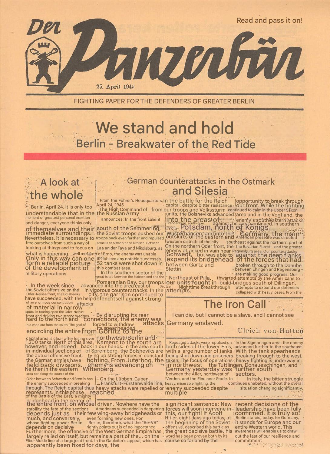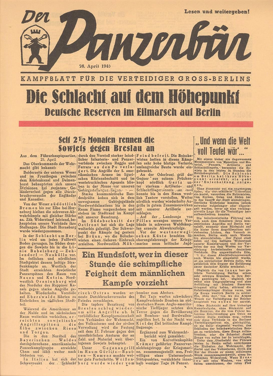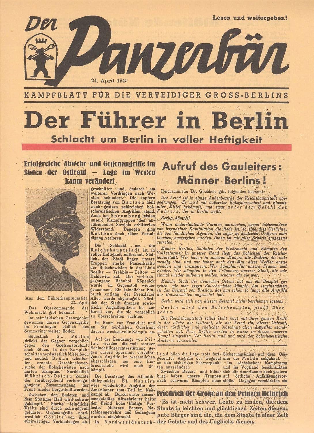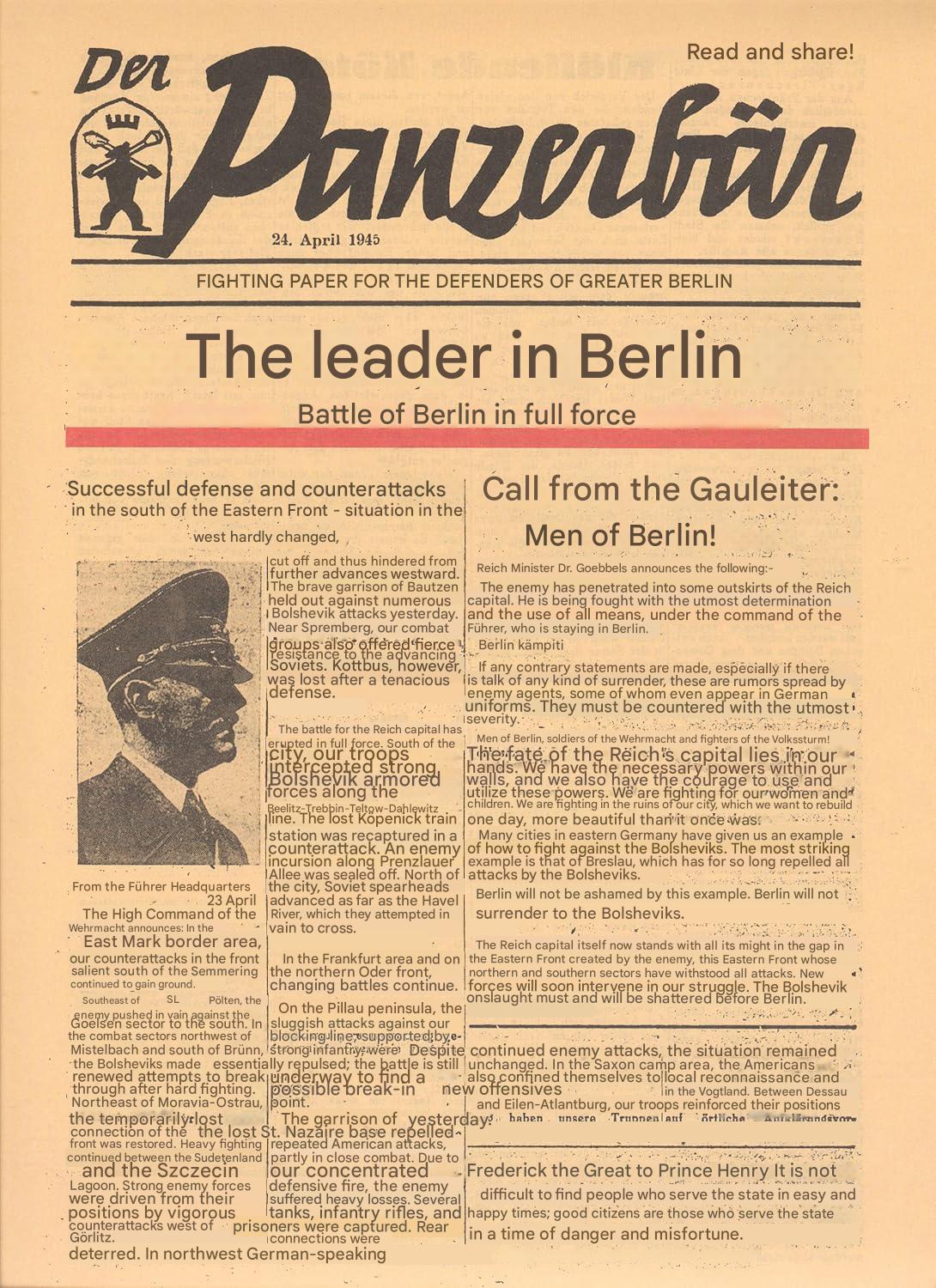 [Below: Okay, now to Panzerbär (Armored Bear). This was a newspaper from the final days of Berlin for the doomed defenders of Europe. It ran from April 22 - April29, 1945 (eight issues). Note the bear has a Panzerfaust and a shovel in its hands. The bear is the age old symbol of Berlin. To a National Socialist, this newspaper is poetic, sad and beautiful. Heroic in the face of death. Needless to say, it is quite rare. Here is a sampling and a crappy translation of each.]