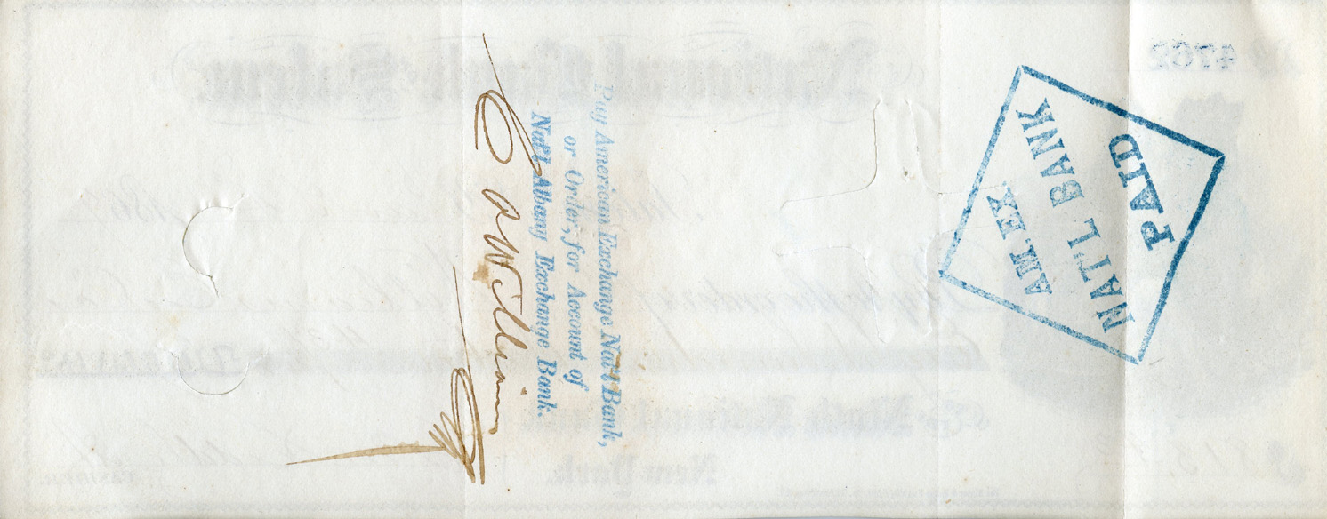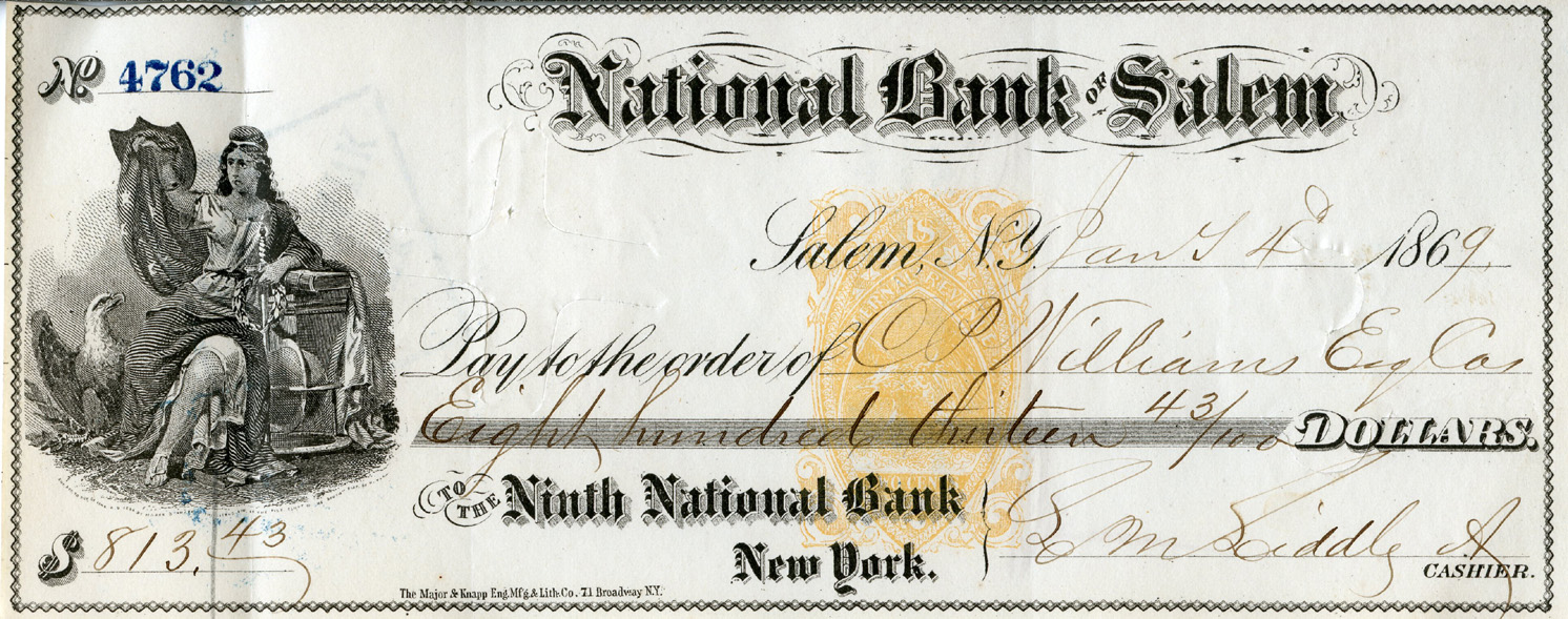 [Below: A check from the National Bank of Salem from 1869. Made out for $813.00, a big sum of money back then. Probably for a magic broom or something of that nature, since Salem is notorious for its witchcraft craze in 1692.]