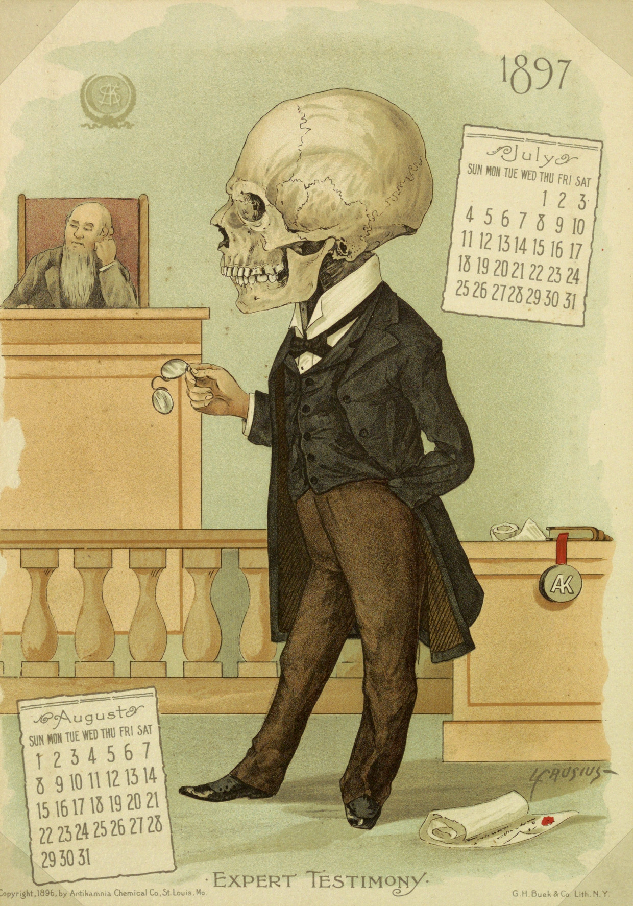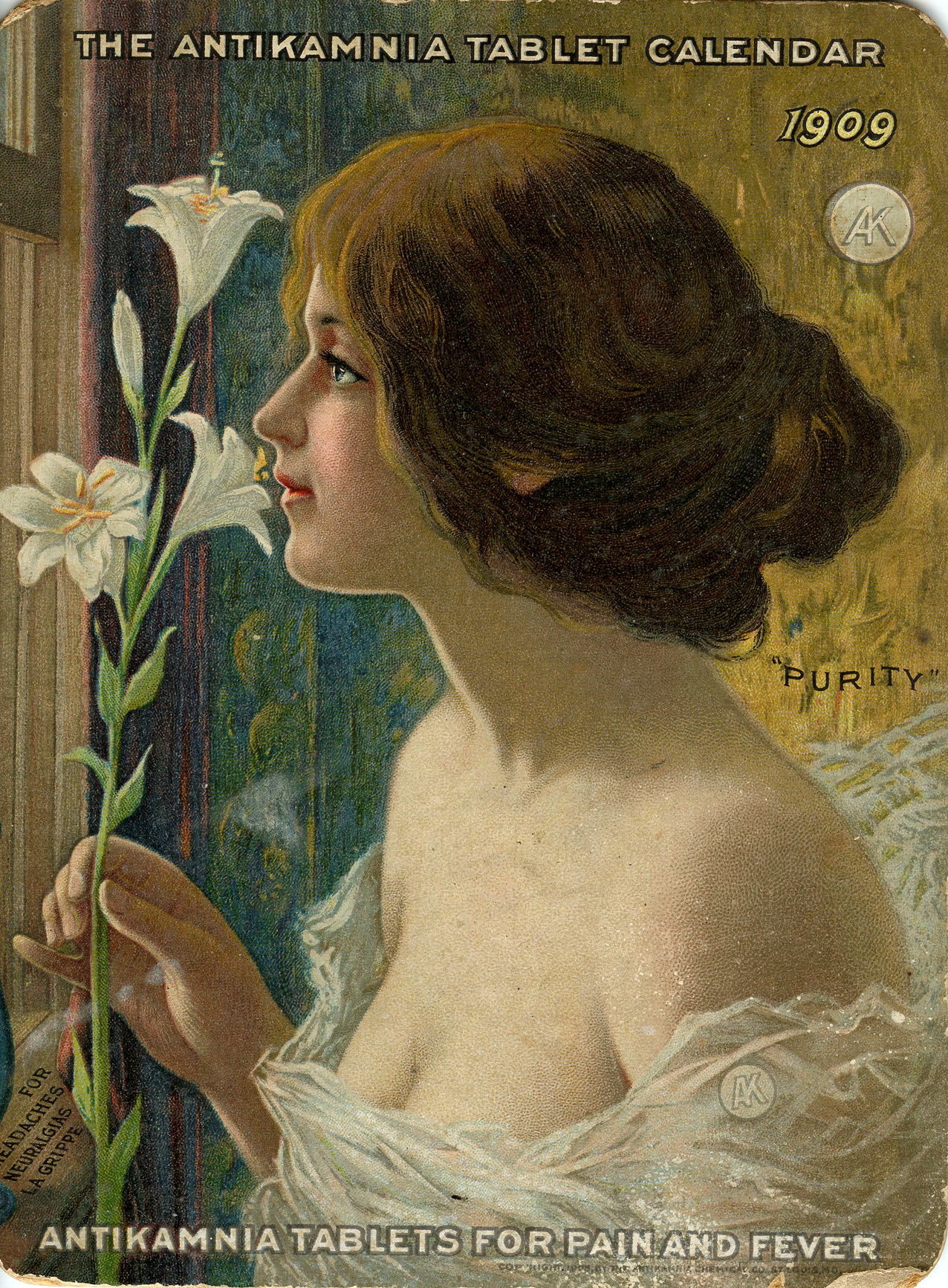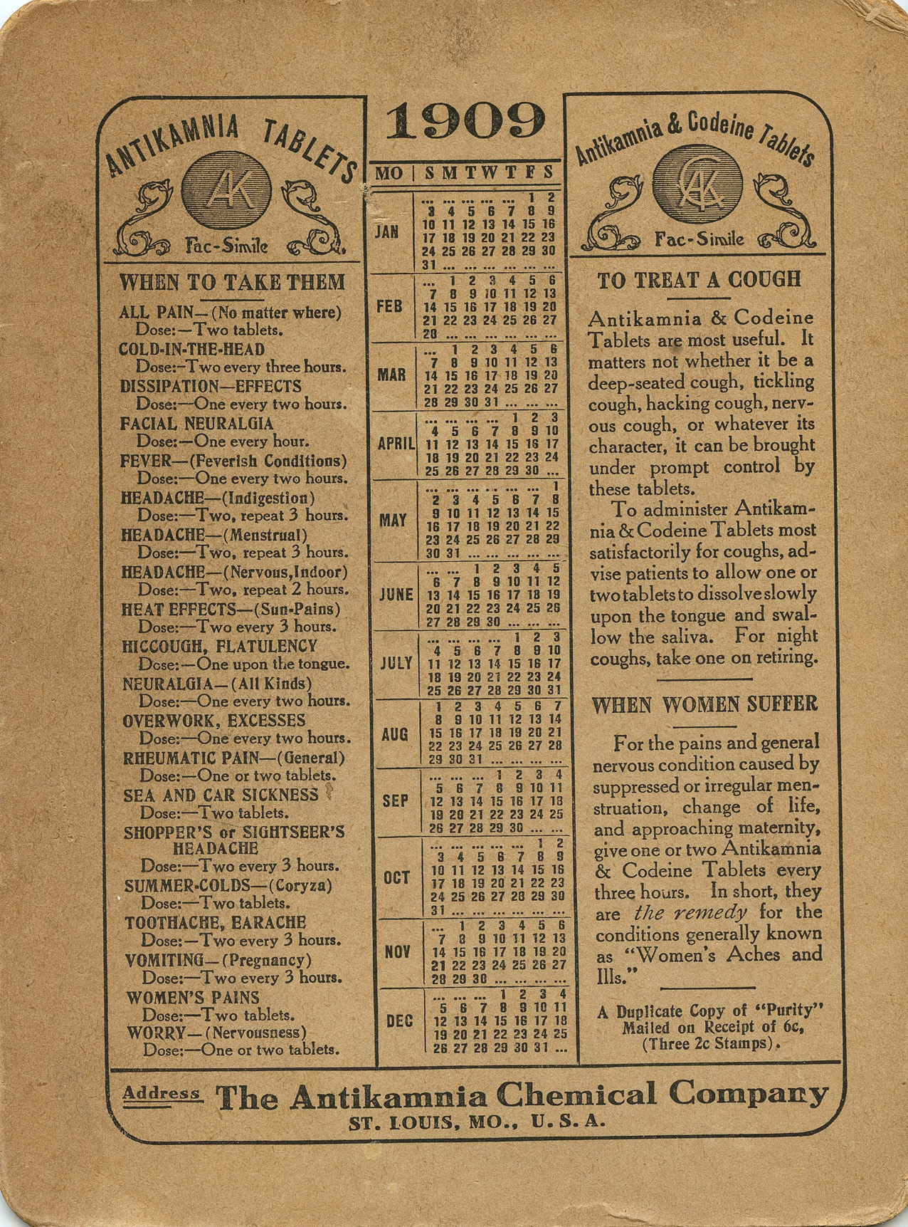 [Below: Advertising calendar from 1909 advertising 'The Antikamnia Tablet'. Antikamnia (derived from the Greek and meaning "opposed to pain"). It was to be used on a wide range of pain, from headaches, muscular pains, aches and simple neuralgia. The main ingredient was acetanilid, which was 'known to be toxic in high doses or in sensitive individuals'. The first death from Antikamnia was reported in 1891, followed by an increasing number of cases over the years.]