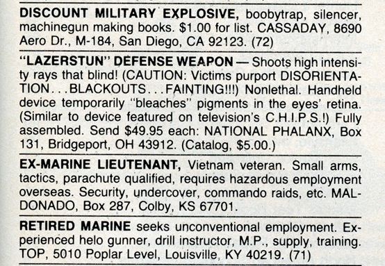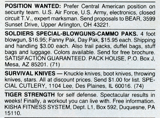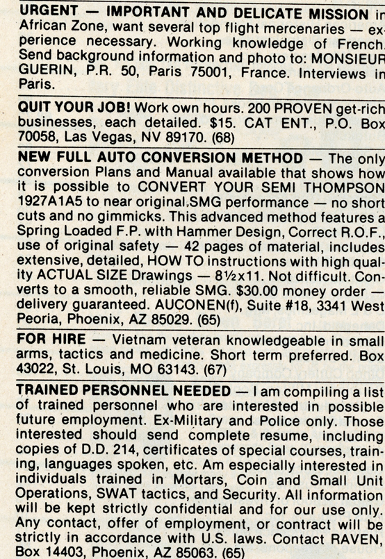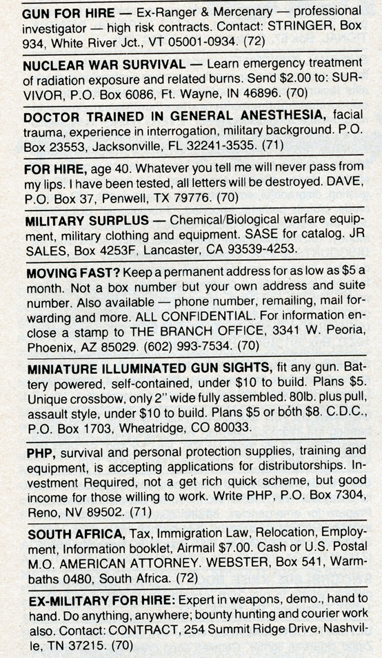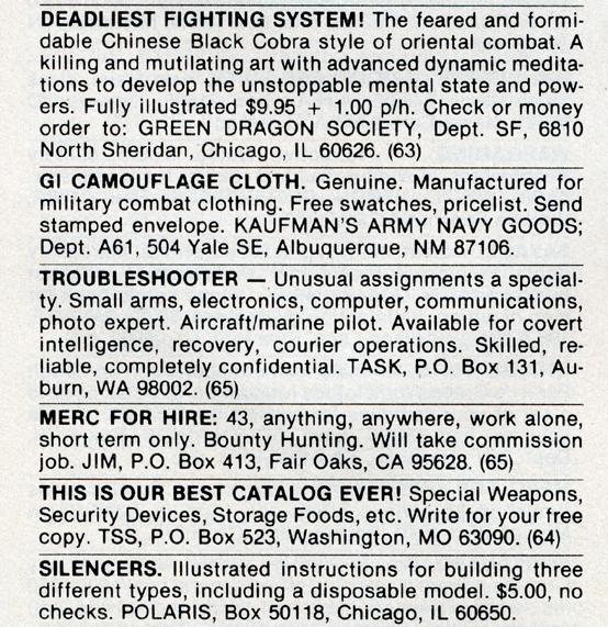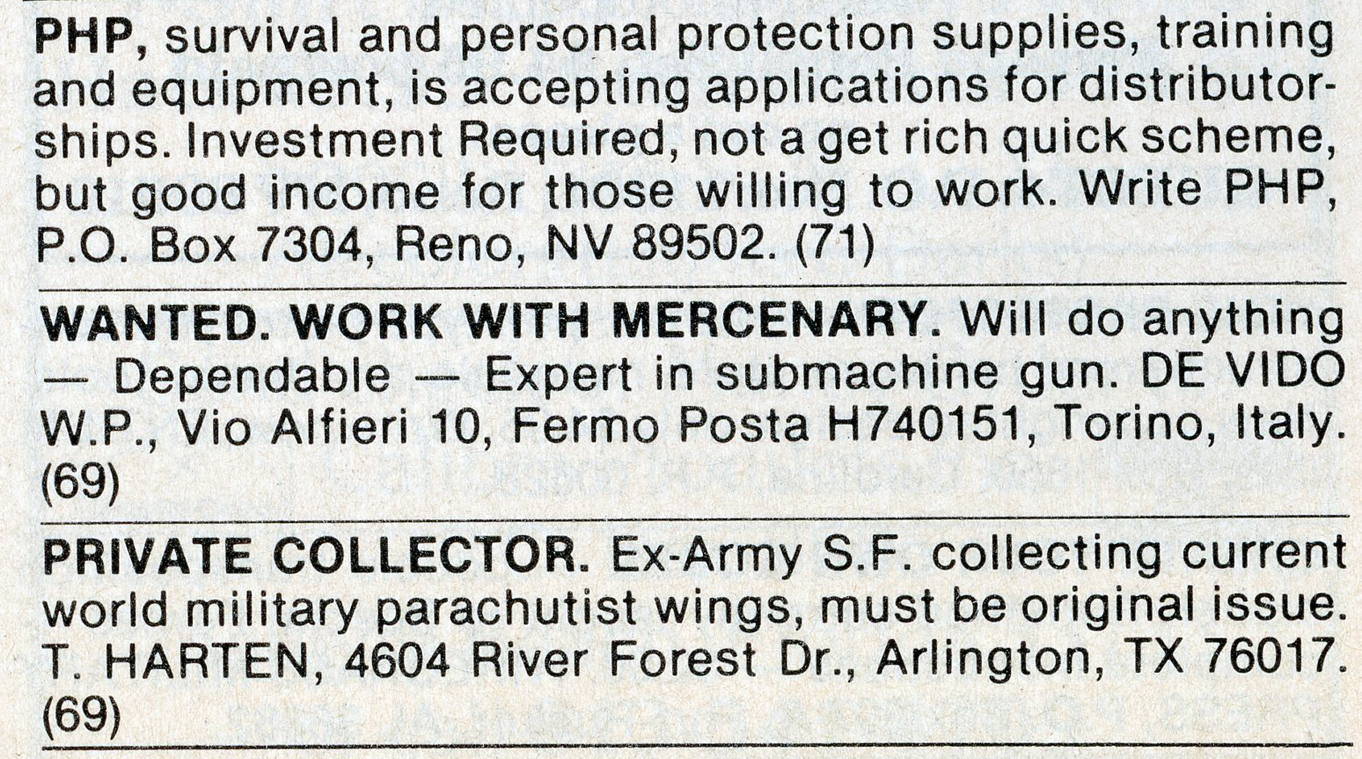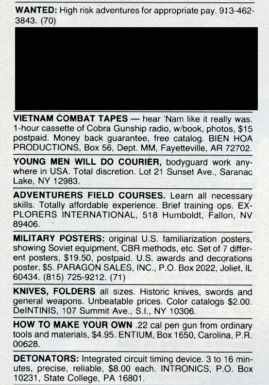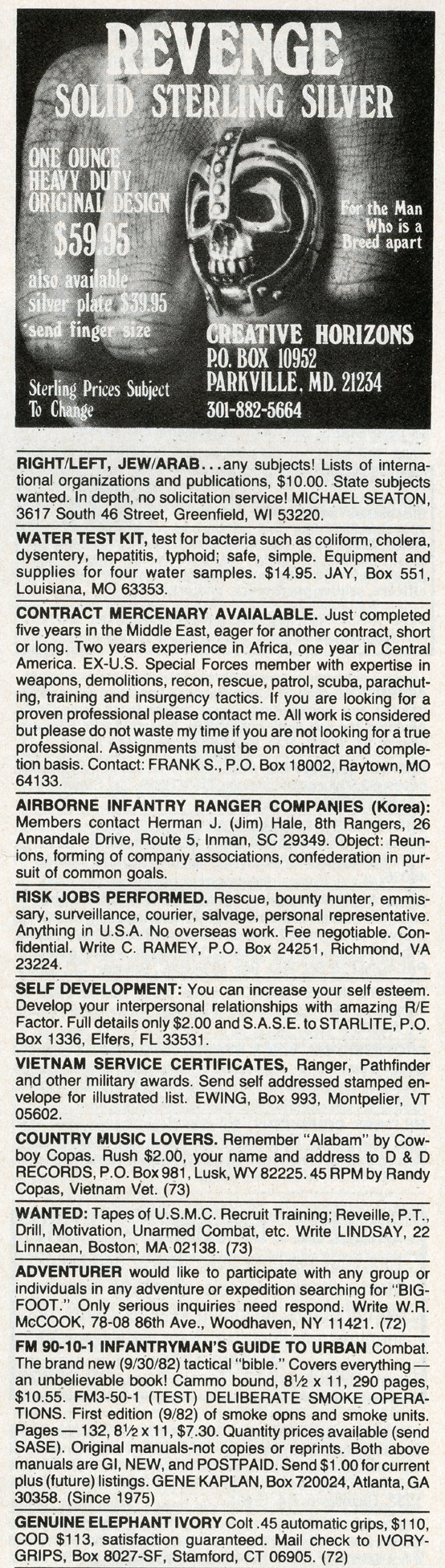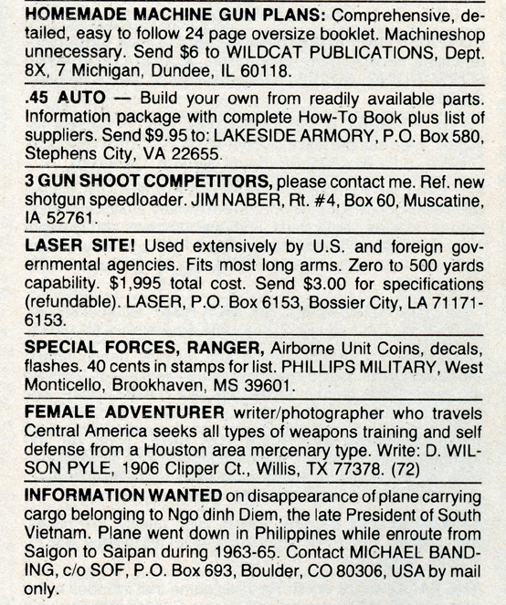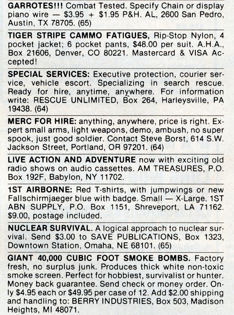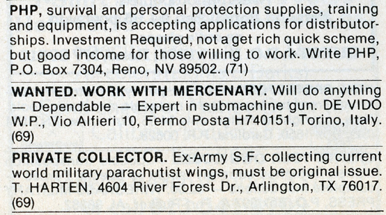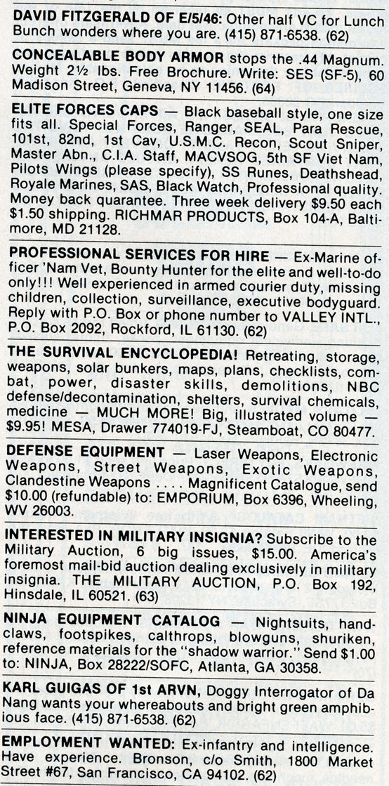 One of the most entertaining aspects of Soldier of Fortune was the personal ads and advertisements. The sheer number of illegal subjects advertised in one form or another is amazing. Compared to now, the 1980s were much freer. Below is a sample of material that you may find entertaining and/or interesting.