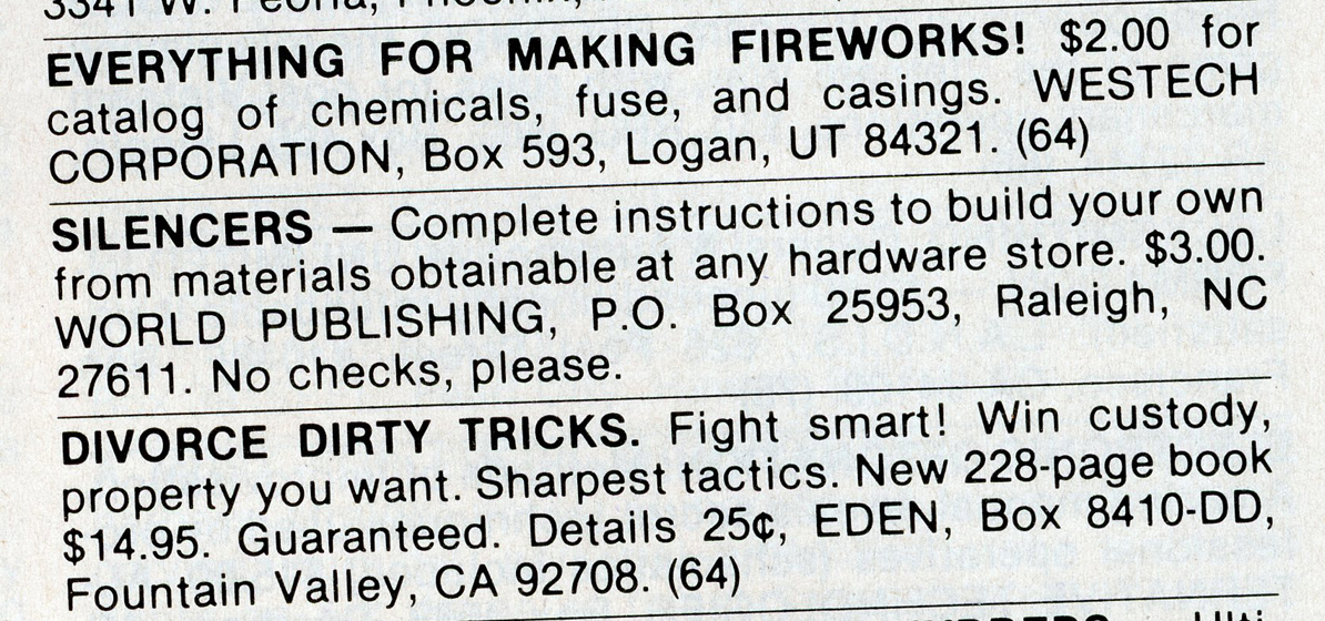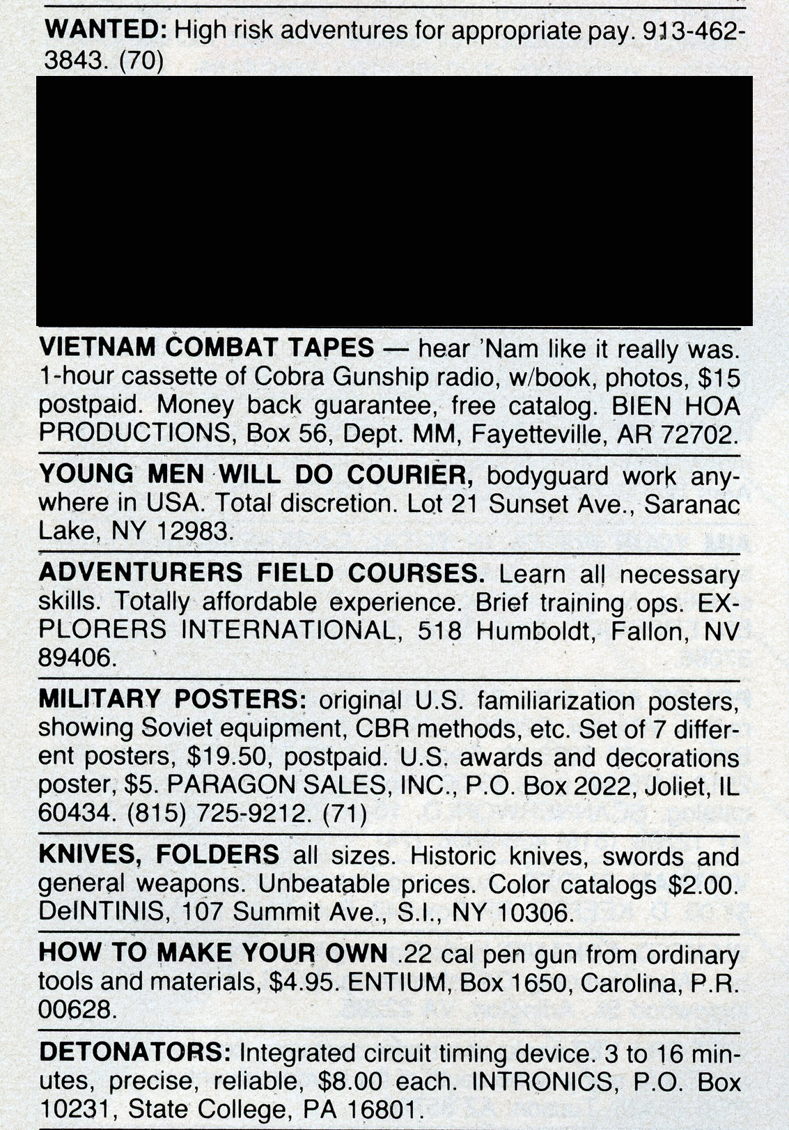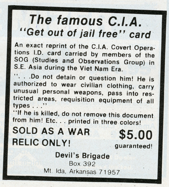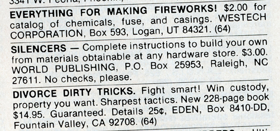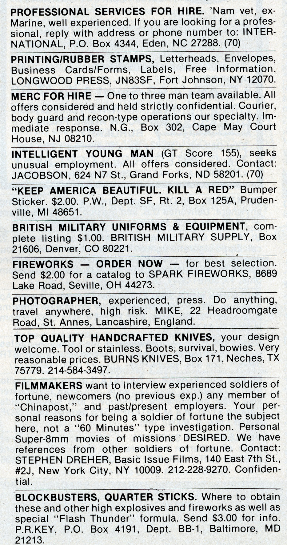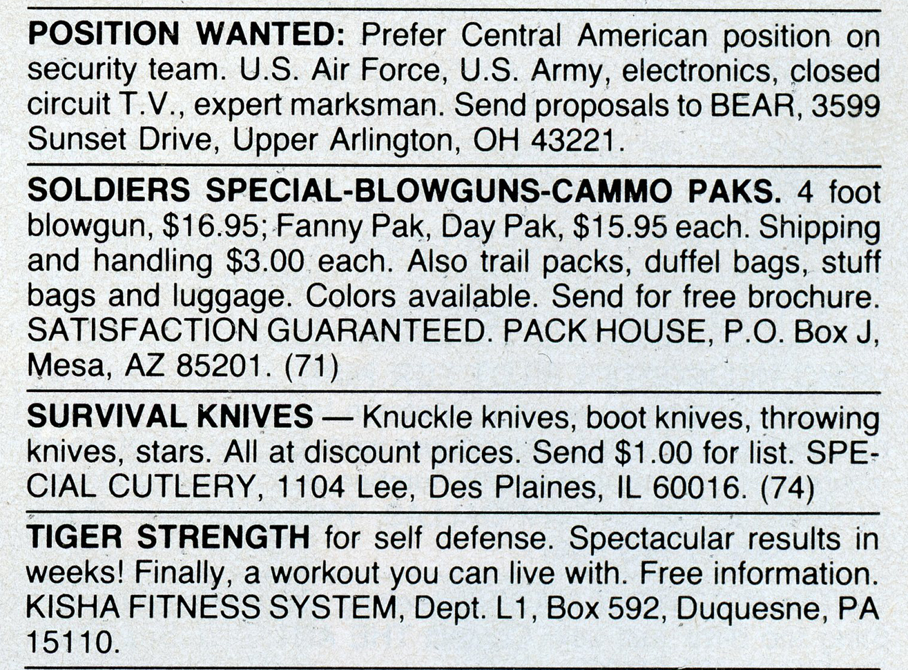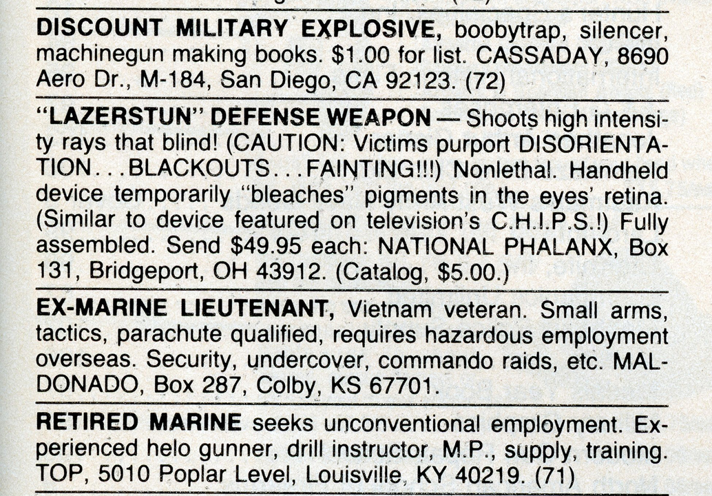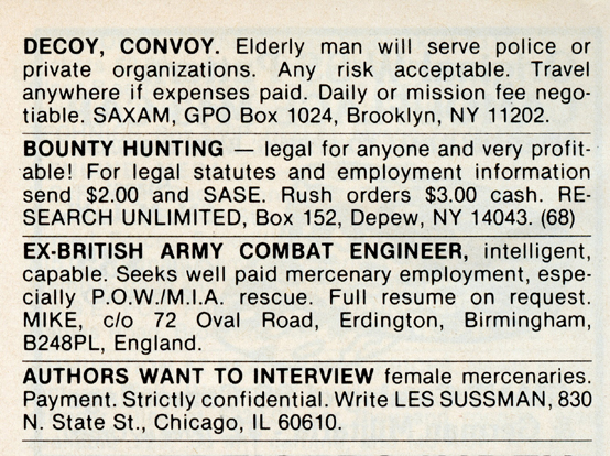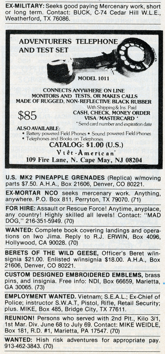 One of the most entertaining aspects of Soldier of Fortune was the personal ads and advertisements. The sheer number of illegal subjects advertised in one form or another is amazing. Compared to now, the 1980s were much freer. Below is a sample of material that you may find entertaining and/or interesting.
