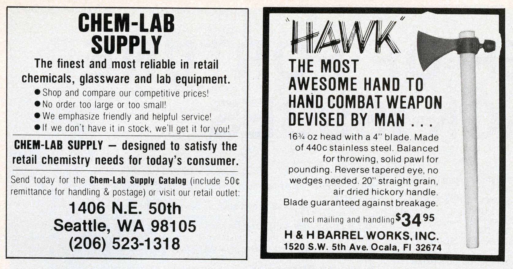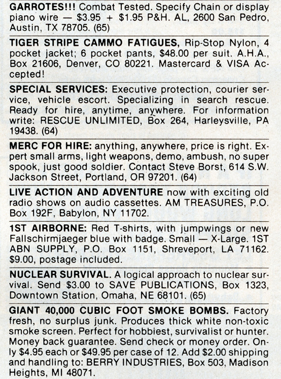 [Above: Combat tested garrotes? In combat where? I've read my share of special forces books and have never read anyone claiming they used garrotes on enemies, but I suppose it could have happened. Another ad from 'Rescue Unlimited' is looking for someone to rescue. You have to wonder who he expected to contact him about rescuing someone. Police: 'We have twenty people being held hostage in a foiled bank robbery. Let's contact Rescue Unlimited.' The merc ad below this one brags that he is no 'super spook', I have a feeling that many of these ads are put out by 'super spook' FBI agents looking to entrap people.]