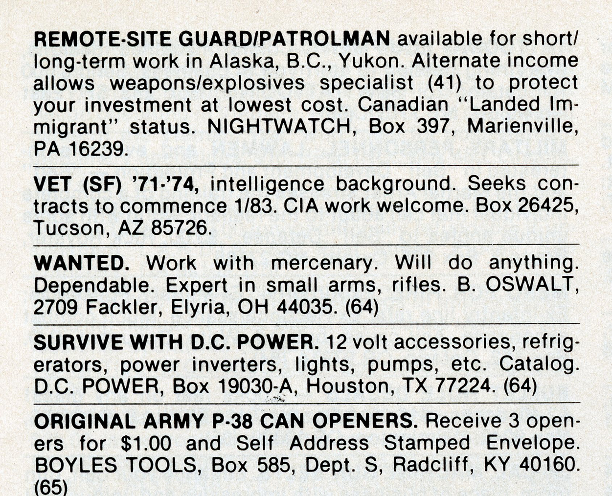 [Above: Nightwatch will somehow protect your property with explosives! Next ad down is a self admitted super spook looking for CIA work. Those p-38 can openers are a great thing though.]