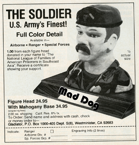 [Above: Lunch Bunch wonders? What the heck is this talking about? Here is a merc for the 'elite and well-to-do only!!!' Laser weapons again. I wonder if this is the type that can change your eye color like the one mentioned above? 'Doggy Interrogator of Da Nang'? Is it too late to write the last guy and address it to: Smith c/o Bronson?]