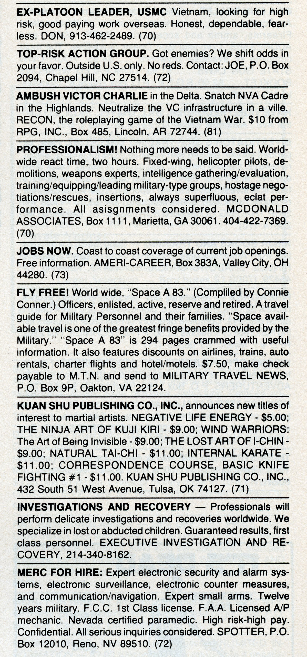 [Above: Another courier. Free Kung Fu lessons! McLisa you must teach me the ancient art of the Chinese Black Cobra. Rhodesian veteran reunion. Those Rhodesian guys from the Rhodesian Bush War crushed their enemies, but politically lost the war. They killed their enemies about 10 to 1 (1361 commanded by mostly white guys vs. 10,000 mostly black guerrillas). Ah, too bad Alpha Military Industries doesn't have Rhodesian short shorts. Another guy wanting to do courier work... Protect yourself from your poisonous house plants! Yeah sure, or learn what you can poison people with. Jim Dallas is the first to offer scuba work. And... courier work. What were these guys delivering? Drugs? Lastly, THE ANT is seeking short term work, nothing too dirty.]