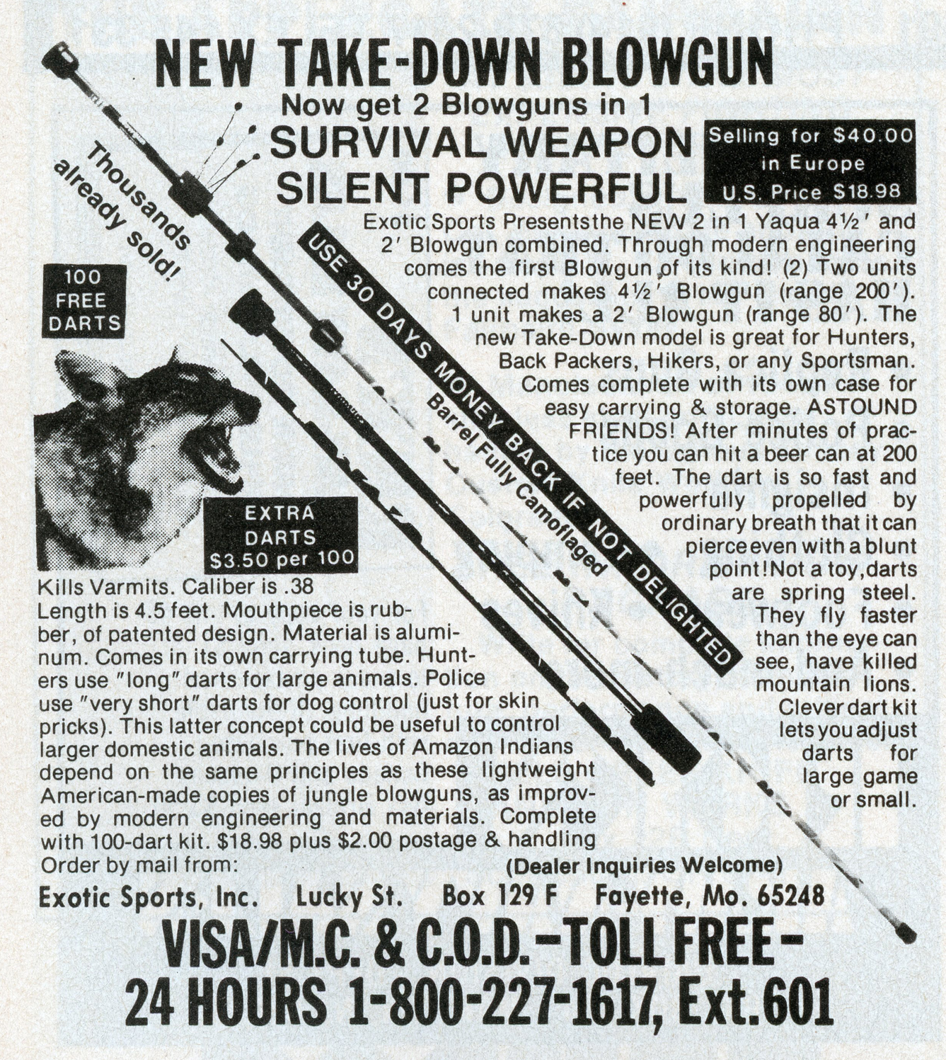 [Above: How absolutely degenerate and barbaric, marketing a blowgun to shoot dogs with. Just look at that poor German Shepherd dog... I seriously doubt a blowgun dart has killed a mountain lion! Maybe if you rub them down with your houseplants.]