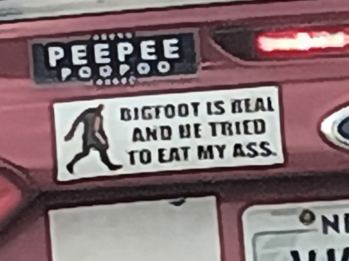 Note: 'Bigfoot is real and he tried to eat my ass'... 'Peepee poopoo'... can you imagine being so vile? What sort of mental illness would make a person put these stickers on their car?