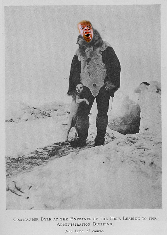 [Above: Byrd himself, circa 1930. Check out that dog clinging to his leg. Have you ever seen the masterpiece of a movie The Thing from 1984? Well I wouldn't be letting that dog cling to my leg... get the flamethrower for god sakes!]