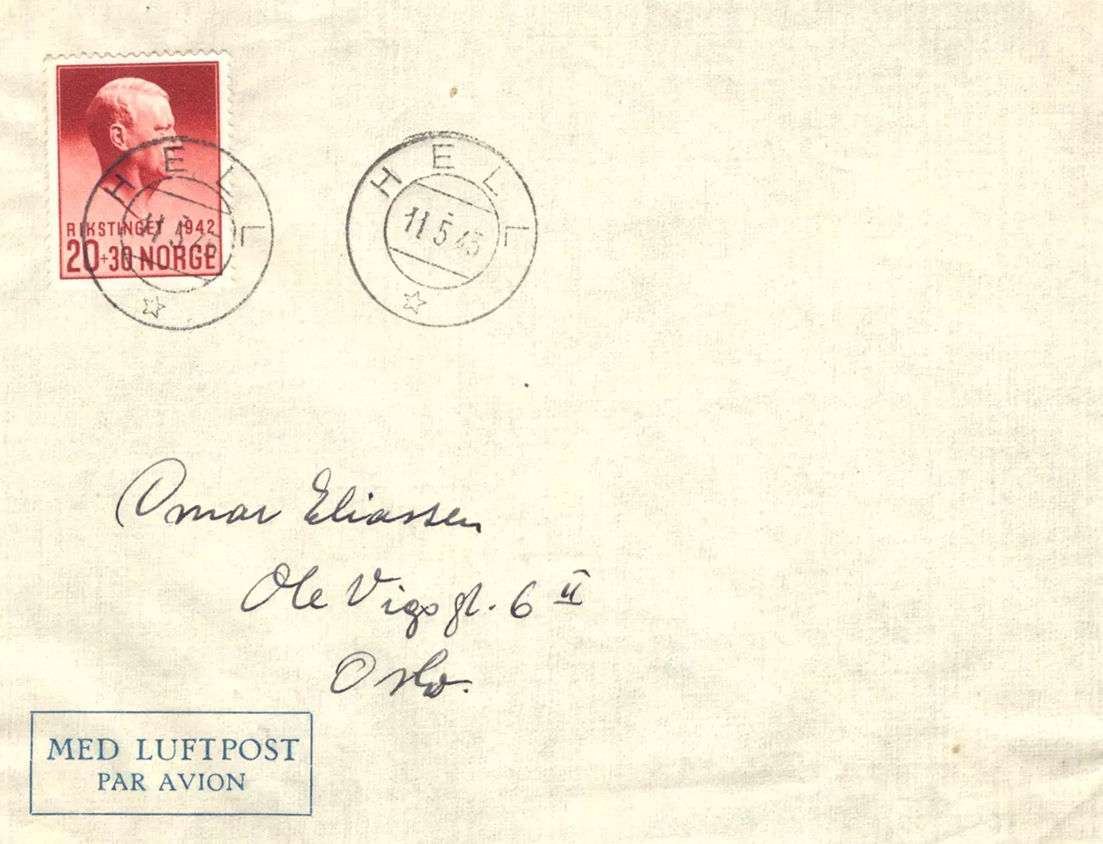 [Above: Hell, Norway with a Vidkun Quisling postage stamp postmarked May 11, 1945.]