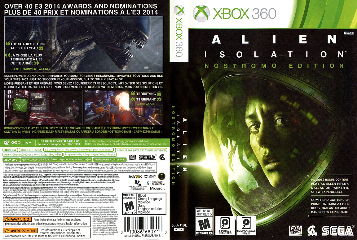 [Below: Alien Isolation Xbox 360 version. Back/front.]