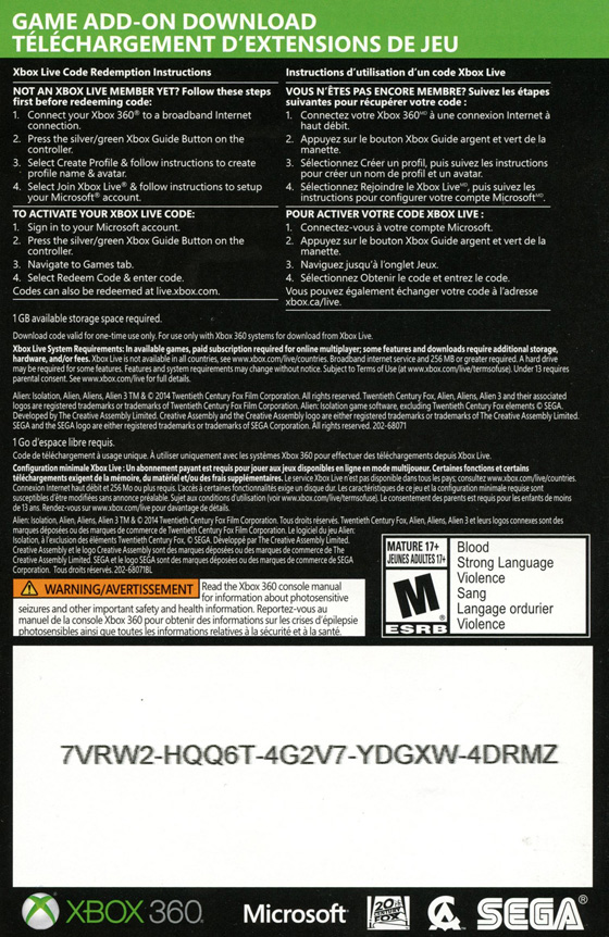 [Below: Alien Isolation Xbox 360 version. Game add-on insert. Back.]